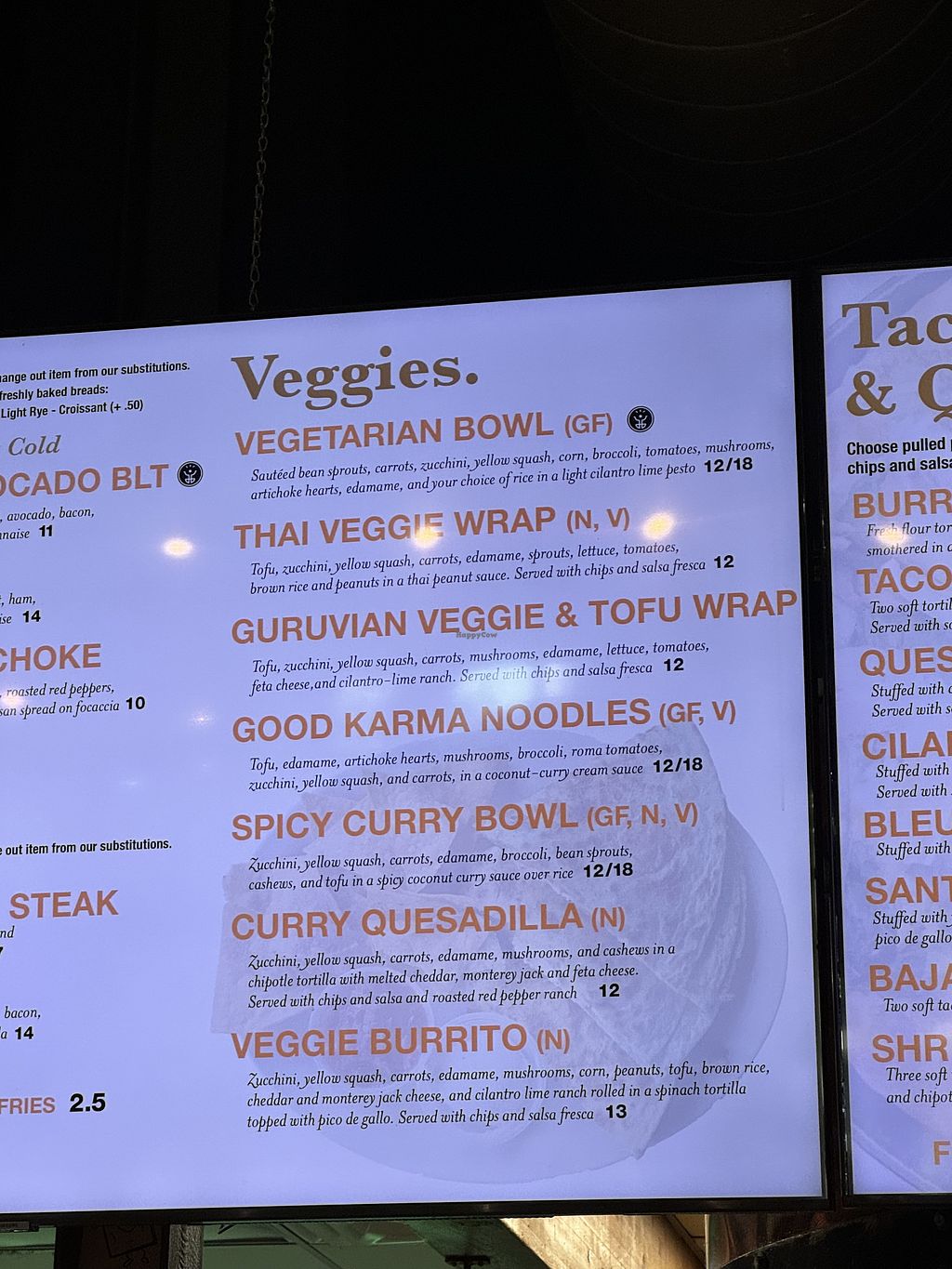 There’s several options and tiny vegetarian menu. Everything is labeled with is great! I got the good karma noodles, and the vegetarian got the guruvian veggie and tofu wrap. Both were delicious. The full option of the karma noodles were massive. It’s enough for three meals personally.