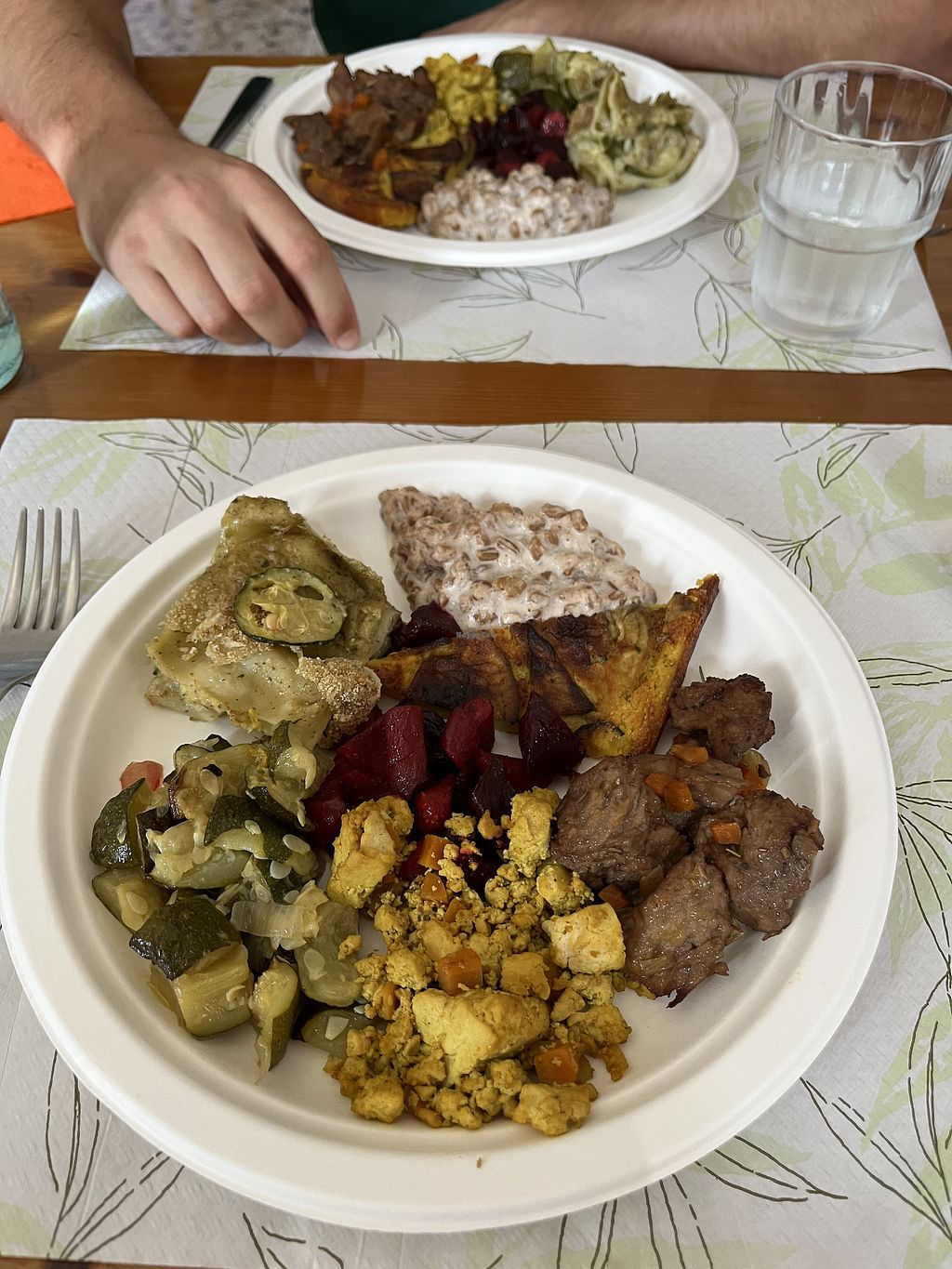 Combo of tofu, tempeh, farinata, and mixed Summer veggies