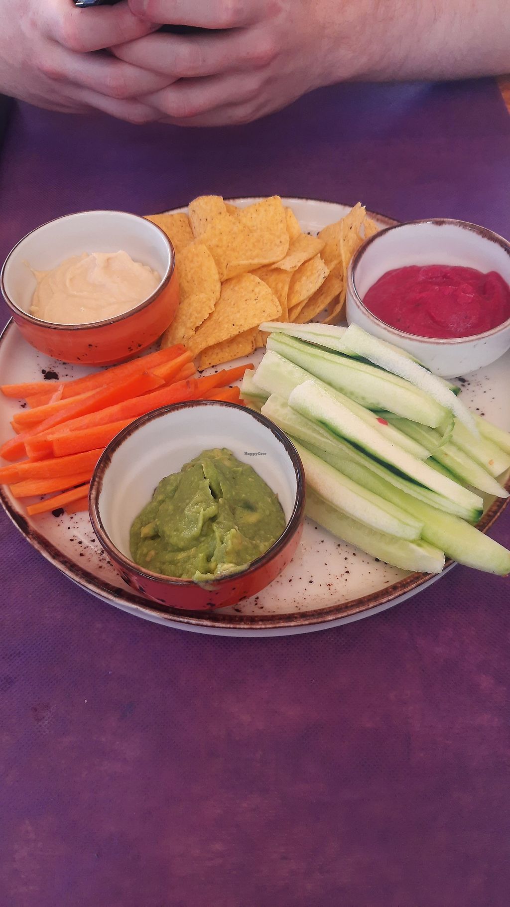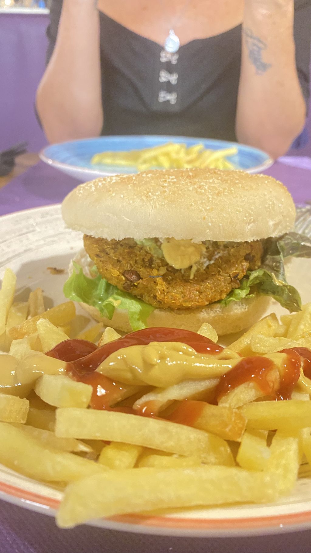 Tienen un par de hamburguesas vegetales (una de ellas con salsa de yogur, si eres vegan sin salsa) y vienen con papas fritas, y una tabla de hummus para dipear.