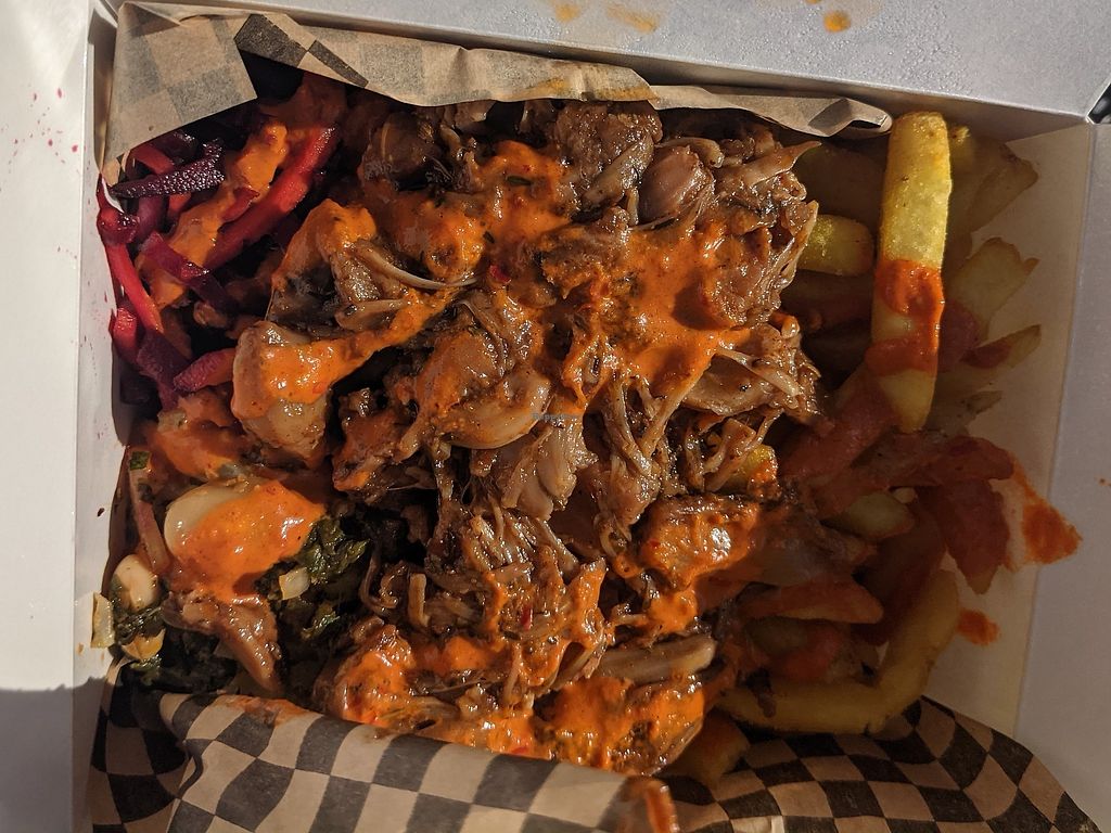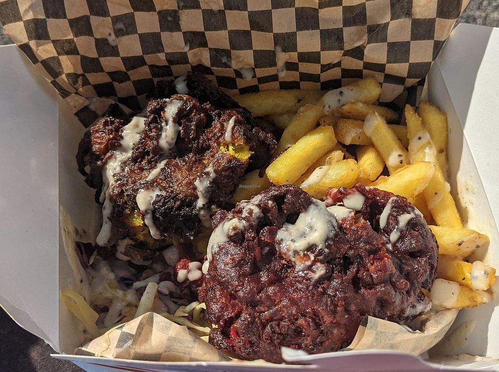 Dirty fries with fritters, and wrap with crispy tofu and avocado mayo