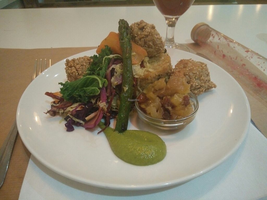 A wonderful warming meal with miso soup, ume-shoyu salad, and a full plate balanced with millet, vegetables, zucchuni pesto, carrot puré and baked chickpeas... They also offer a good vegan burger with sweet potatoe fries, wraps(tacos) and a delicious apple strudel. Finich your meal with a warm kukicha tea.