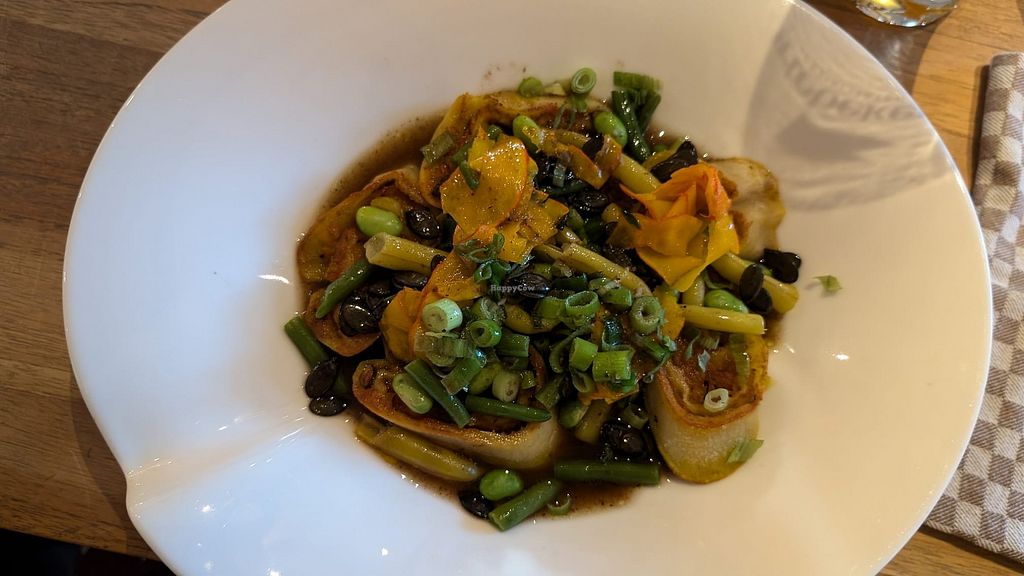 Serves meat, vegan options available. Restaurant offering a vegetarian menu section with some vegan options or options that can be made vegan upon request. Menu is seasonal and changes. Open Tue-Sun 12:00-21:00. Closed Mon.