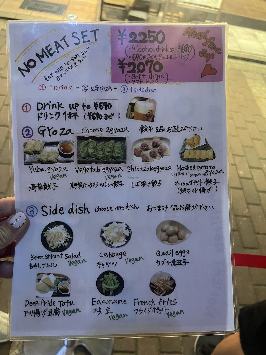 A gyoza restaurant with vegan options. The English menu clearly explains the vegan options. There are only two vegan dumpling choices🥟