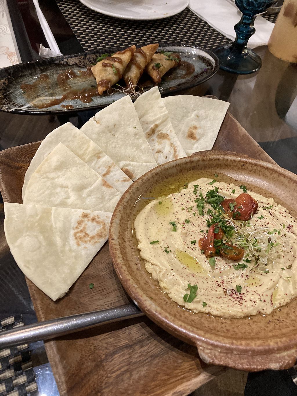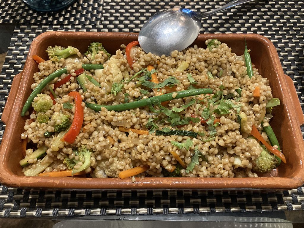 Many options - Starters: Hummus, salt and pepper mushrooms, Samosa or Spring rolls. Soup: carrot, ginger and miso. Mains: Dan Dan noodles, paella, Alio olio noodles, miso mushroom soup and a couple of salads.