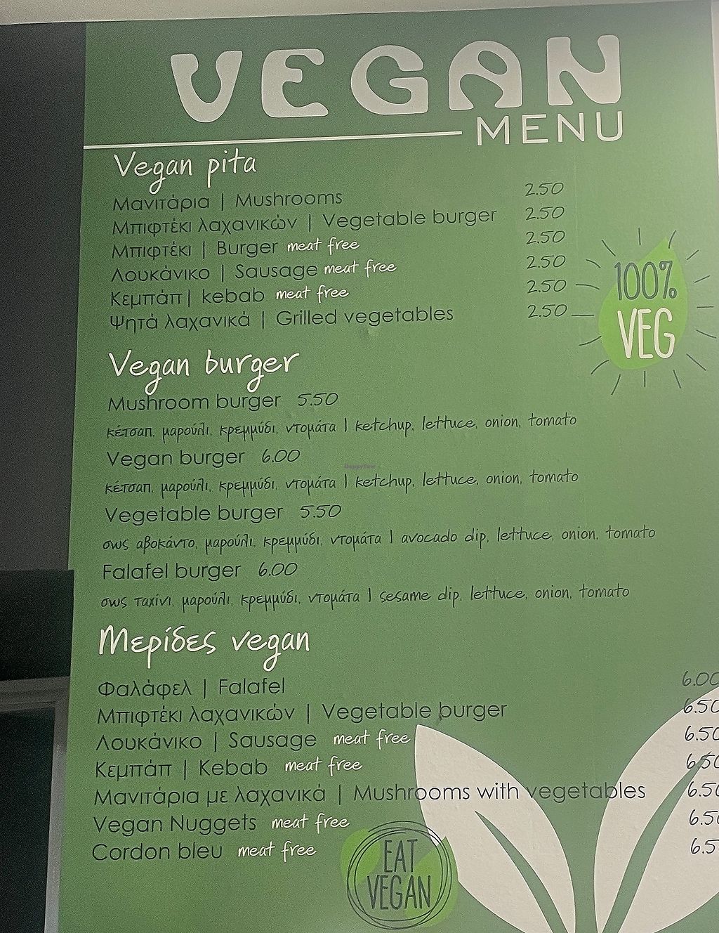 We ate the vegan falafel pita which was nice. Good fresh felafel, nice people, and well priced. Full vegan menu 🥰