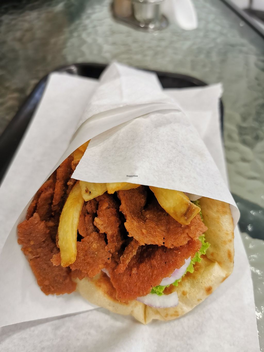 Le restaurant dispose d’une carte de plat Vegan et végétarien. J’ai dégusté un délicieux gyros végétarien, avec des crudités et un simili carné (en quantité généreuse dans le gyros). Le tout est bien assaisonné !