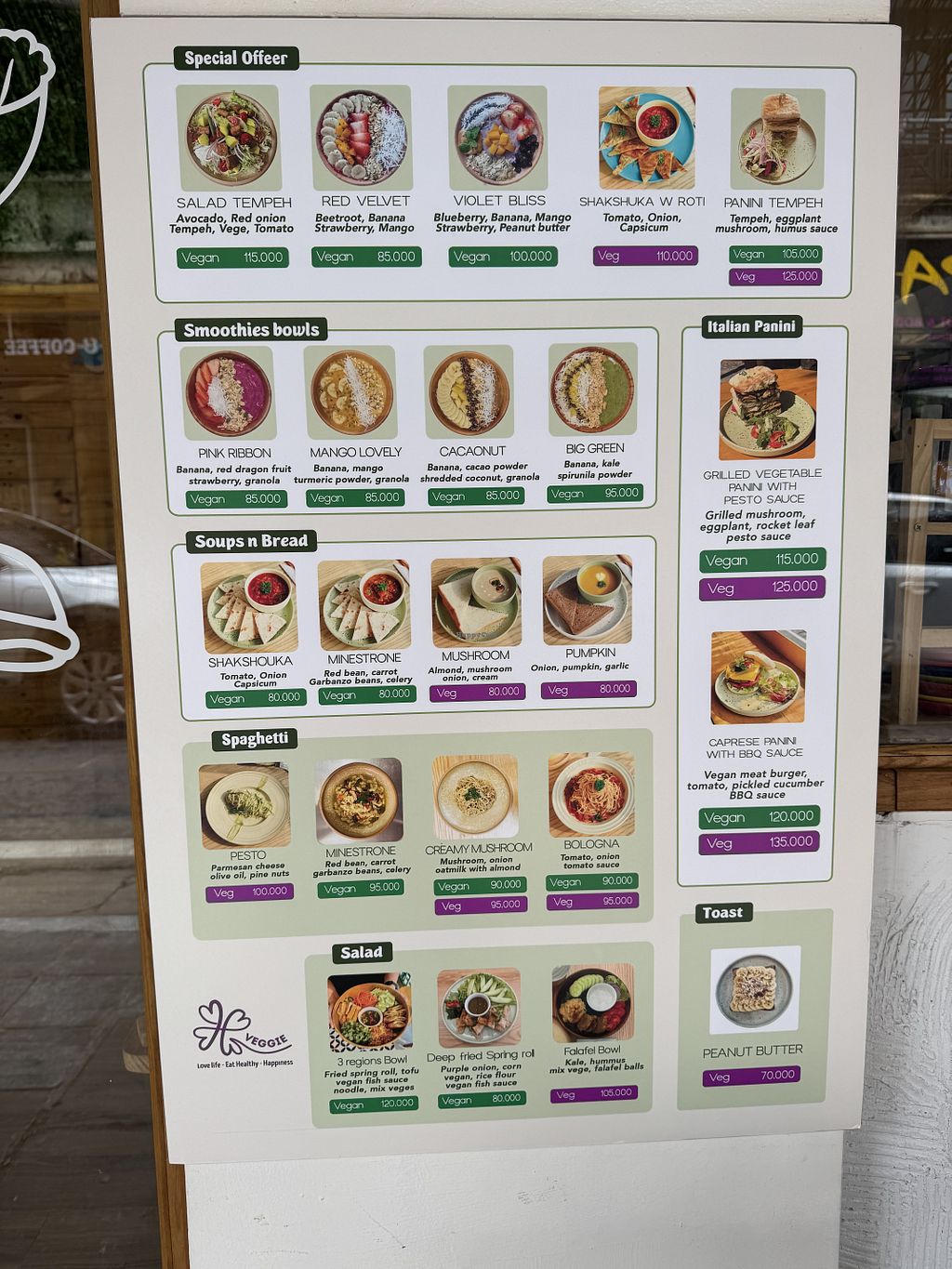 Excellent selection of choices for both vegans and vegetarians, I ordered the cocoanut smoothie bowl and fresh orange juice and both were lovely. Other options on the menu looked great too. Highly recommend.