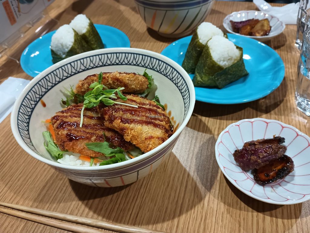 Katsudon and onigiri. The little dish on the side is sweet potato-base…