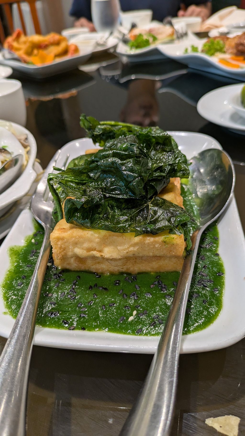 We arrived too soon for the vegan menu but dim sum was on offer with some vegan choices. The food itself was nice enough, but the table was overlooked by a wall of grubby glass tanks containing the dismal death-row lobsters and fish. No thank you!