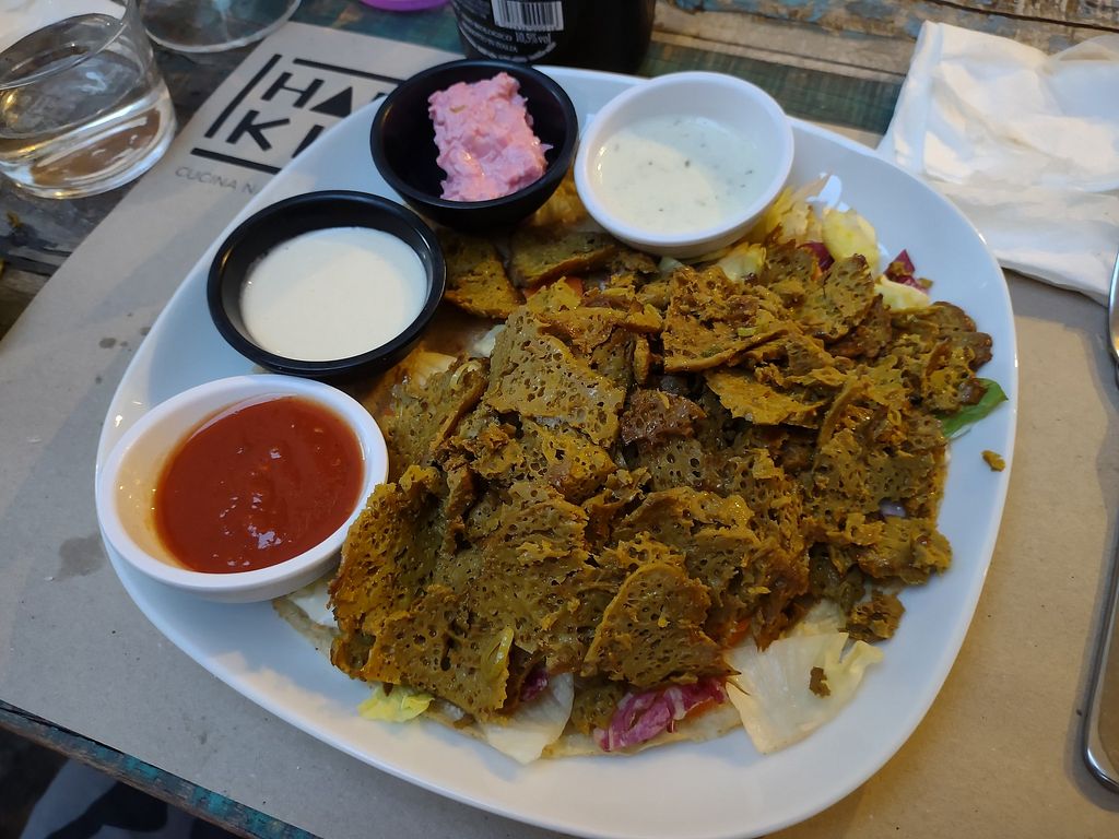 There were good vegan options, seitan kebab and chickpea omelette were nice, outdoor eating and relaxed environment.
