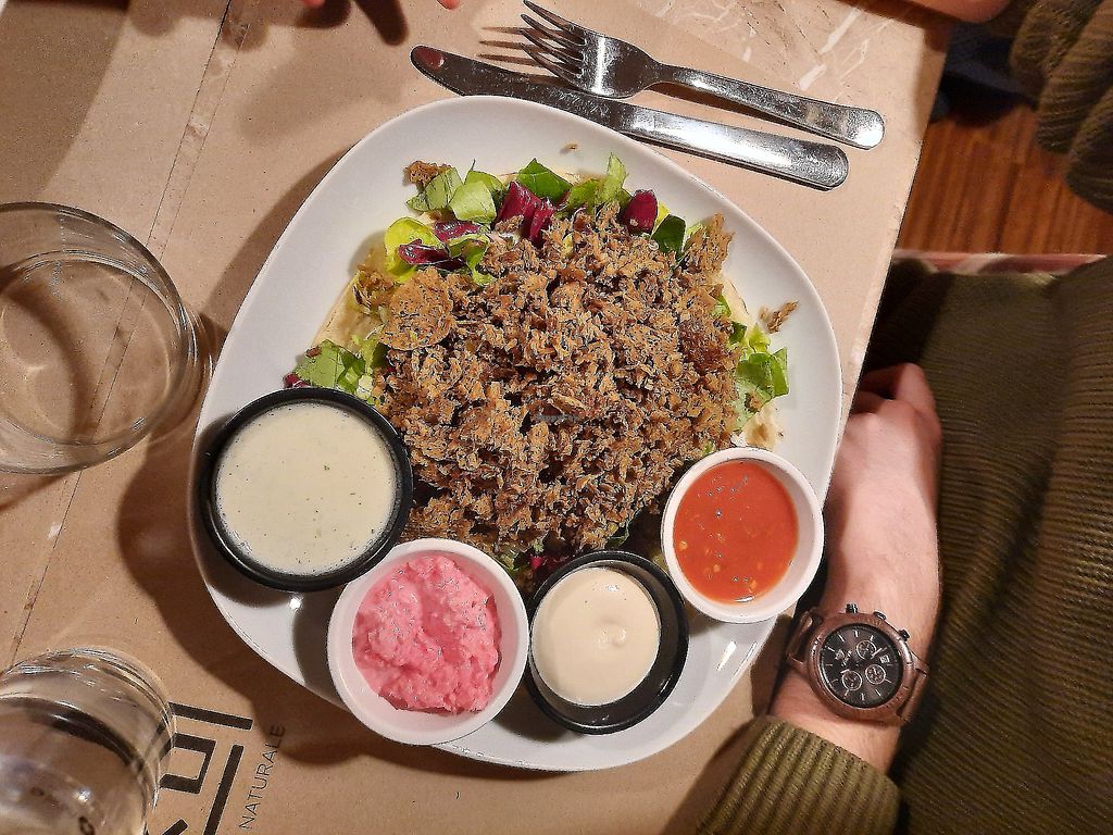 We ordered falafel snack (8€ for a few little balls), braised tempeh, pappardelle and a pancake for the kids, plus wine and desserts. While tempeh was good, pappardelle was very bitter and basically inedible, so my husband had to order another meal. He chose seitan - it was basically a thin pancake with a mountain of salad and thin seitan slices with some sauce. Didn’t look visually appetising but the taste at least was ok.