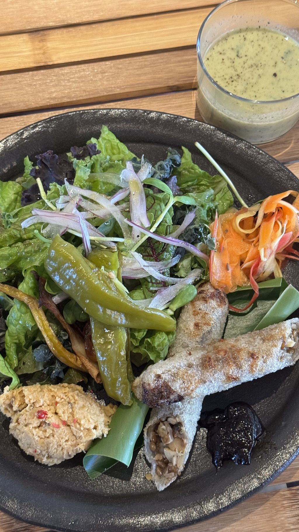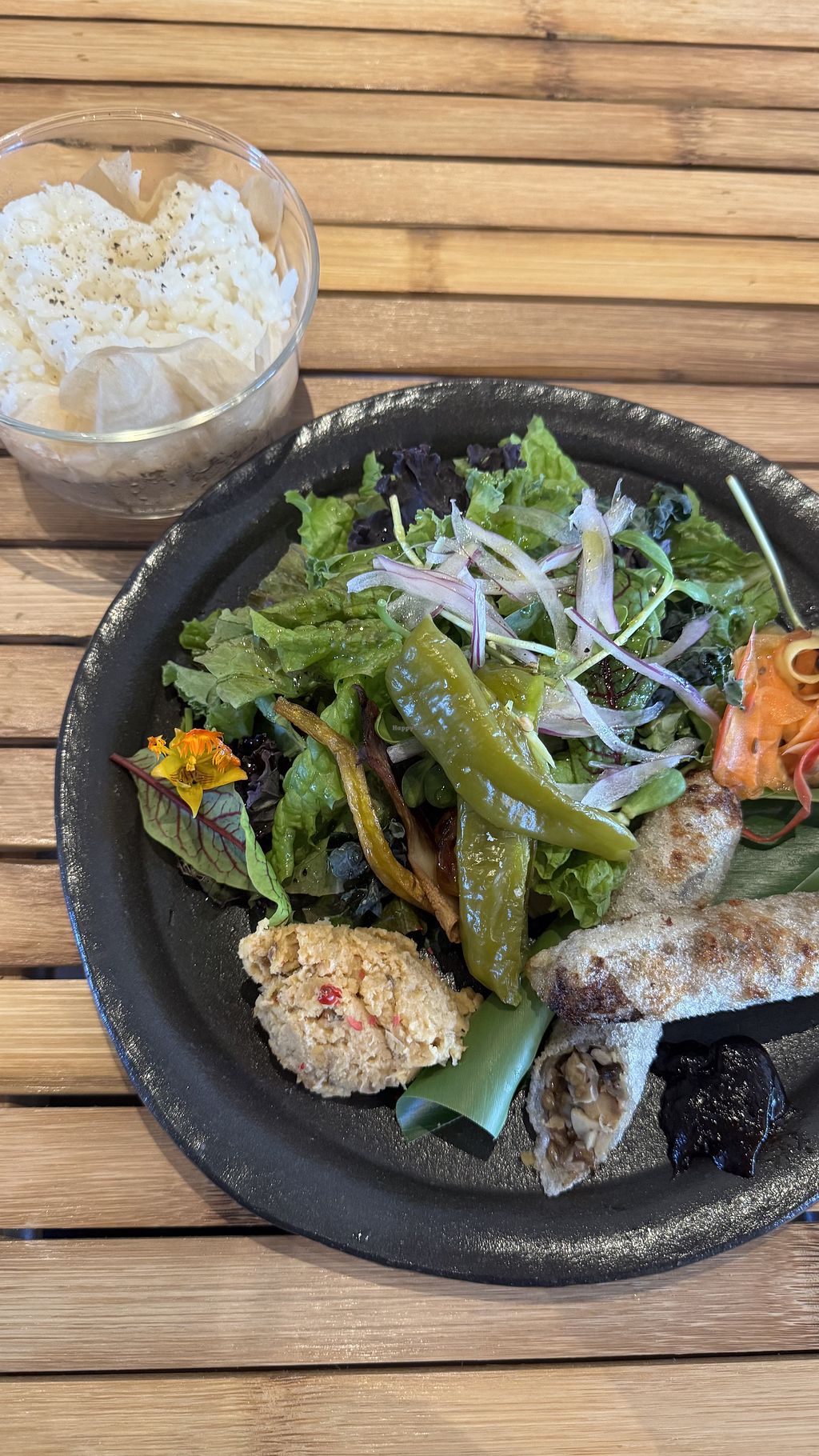 Its not fully vegan, they have meat option too. A lot of vegetables, colorful meals, good taste. We also got a cookie with cream each, free of charge which is great. Payment possible with cash or card, parking is in front.