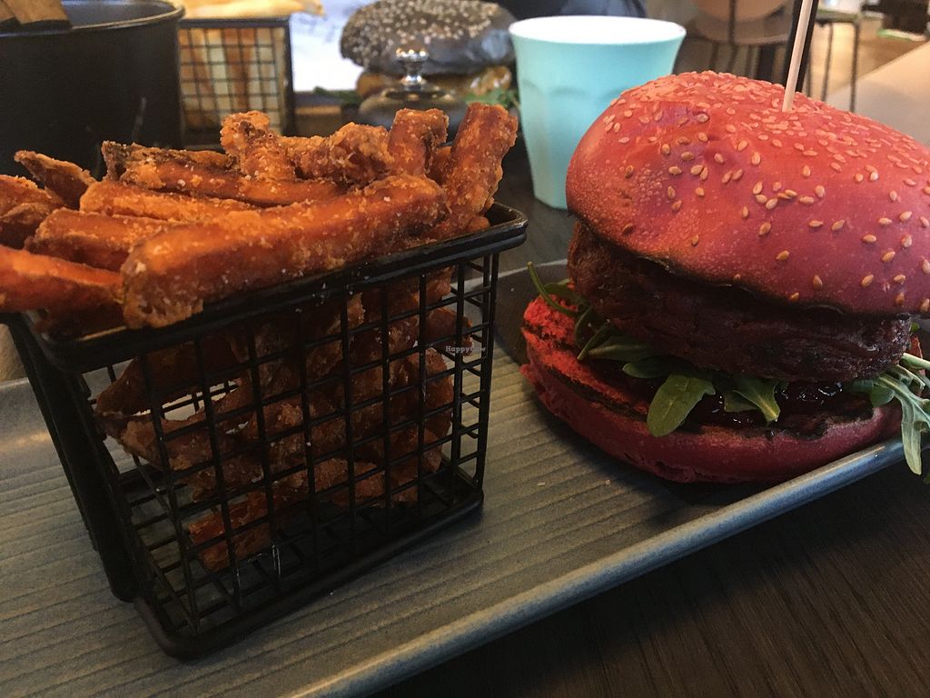 Beetroot Quinoa Burger with Sweet Potato Fries