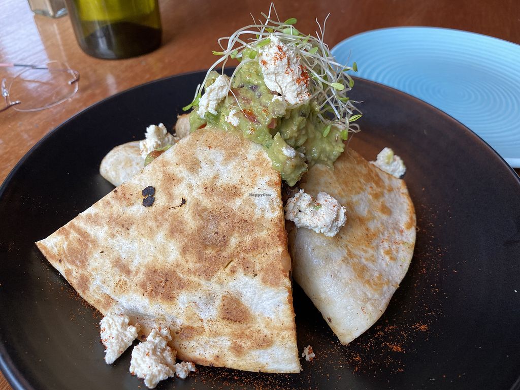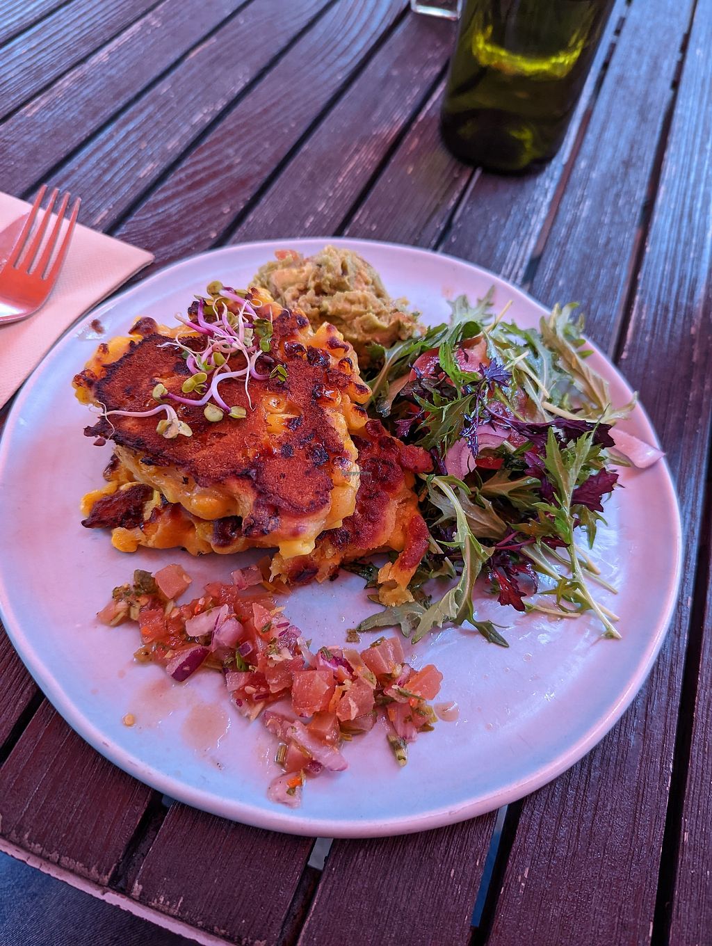 Halo had plenty to satisfy two hungry vegan bellies. The burger and corn fritters were good, but the winner was the jackfruit quesadillas, which were delicious.