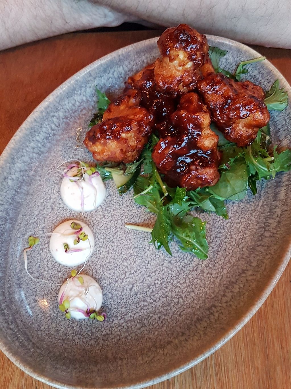 I had cauliflower wings and hubby the coconut corn cakes. Both were very tasty and generous portions.
