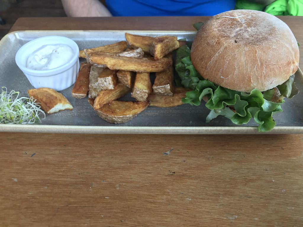 Plenty of vegan options on menu. We had teriyaki Jackfruit burgers with fries. Not exceptional, but very nice. We really liked wasabi Mayo slaw inside of the burger!