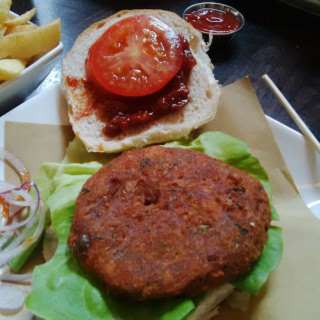 Thai vegetable burger with a vegan cheese slice plus sweet potato frie…