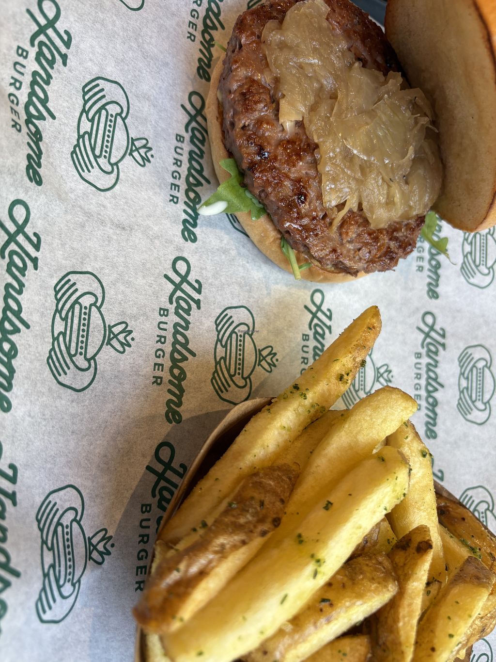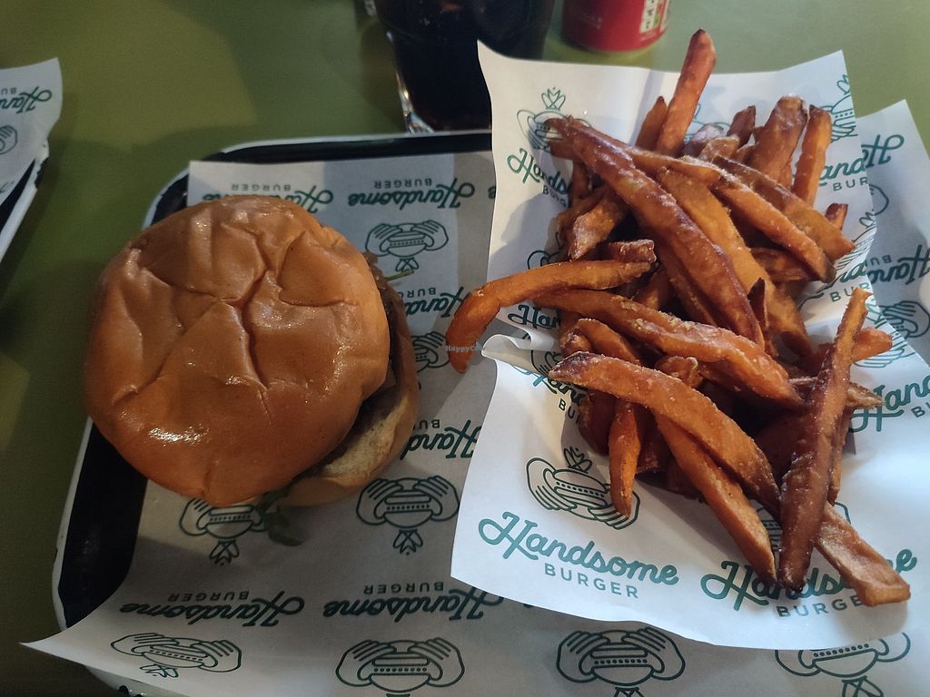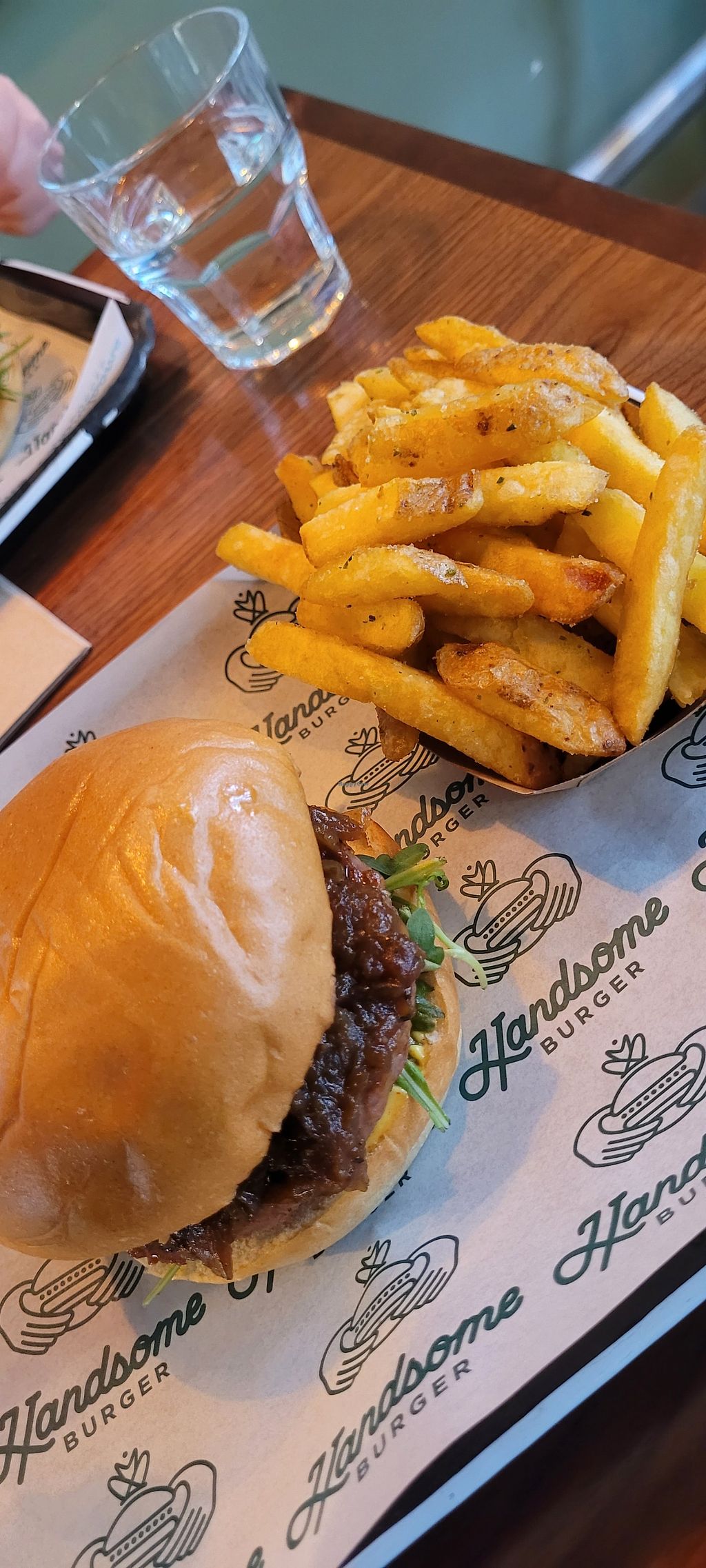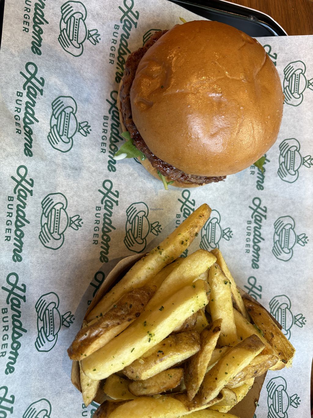 Beyond meat burger & rosemary fries. Both nice & good portion size. Plenty of drinks available & nice outdoor seating