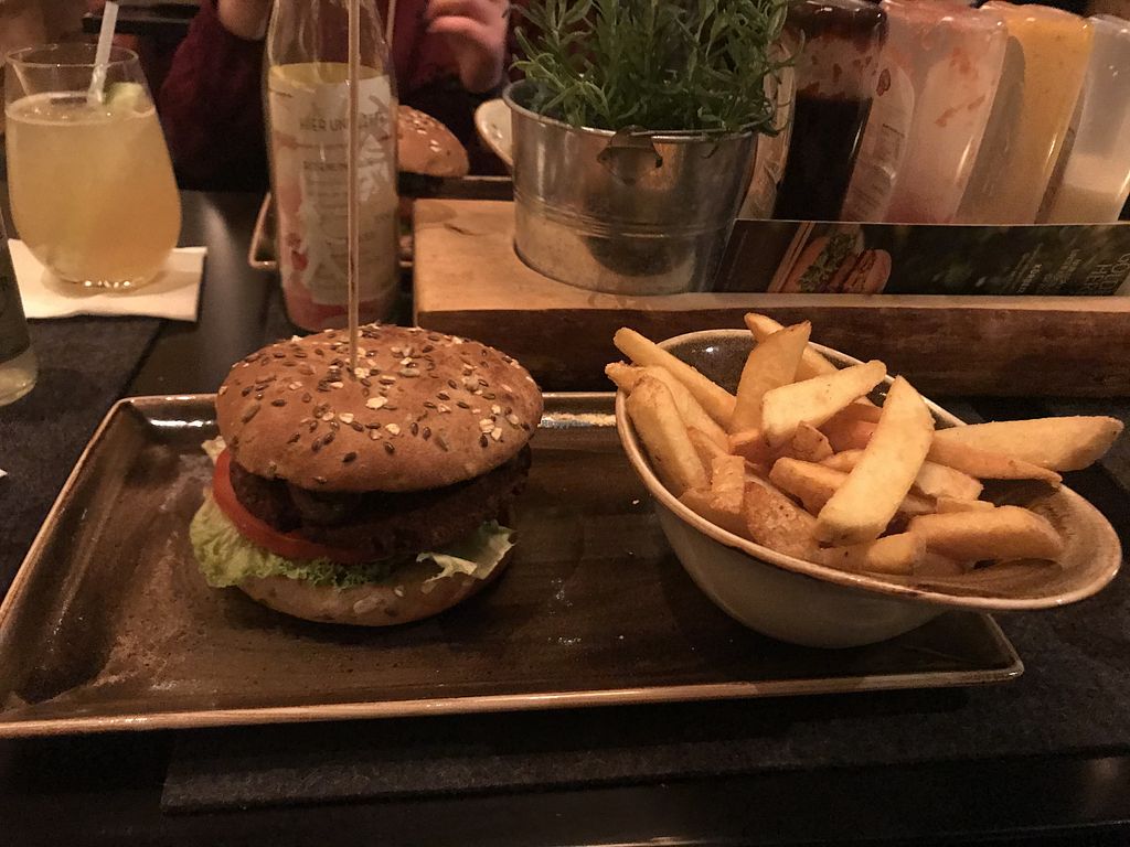 Gemütlich, aber oft sehr voll. Trotzdem ist das Essen sehr schnell da. Tischreservierung ist zu empfehlen. Gute Auswahl an veganen und vegetarischen Burgern. Leider ist kein Milchersatz bei Getränken wie Latte Macchiato o. ä. möglich:(