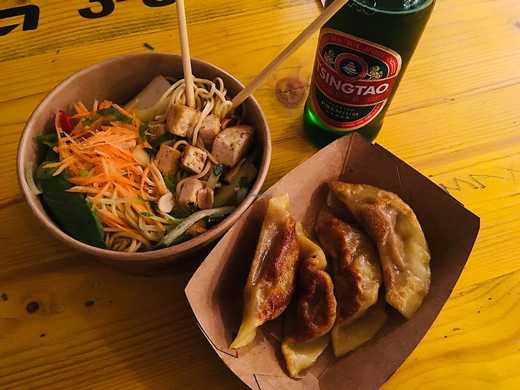 Disappointed that despite arriving at 8pm they had run out of rice and jackfruit so Dan Dan tofu noodles was the only vegan option. Poorly presented (I stirred it up for the photo!) with lukewarm noodles dumped on top of the ingredients in a puddle of sauce- by the time I had stirred it up it was almost cold. Only takeaway packaging despite dining tables. Dumplings were good but, like the noodles, over-priced for a no-frills, fast-food court. A little more love would improve the potential this place has as flavours were good.