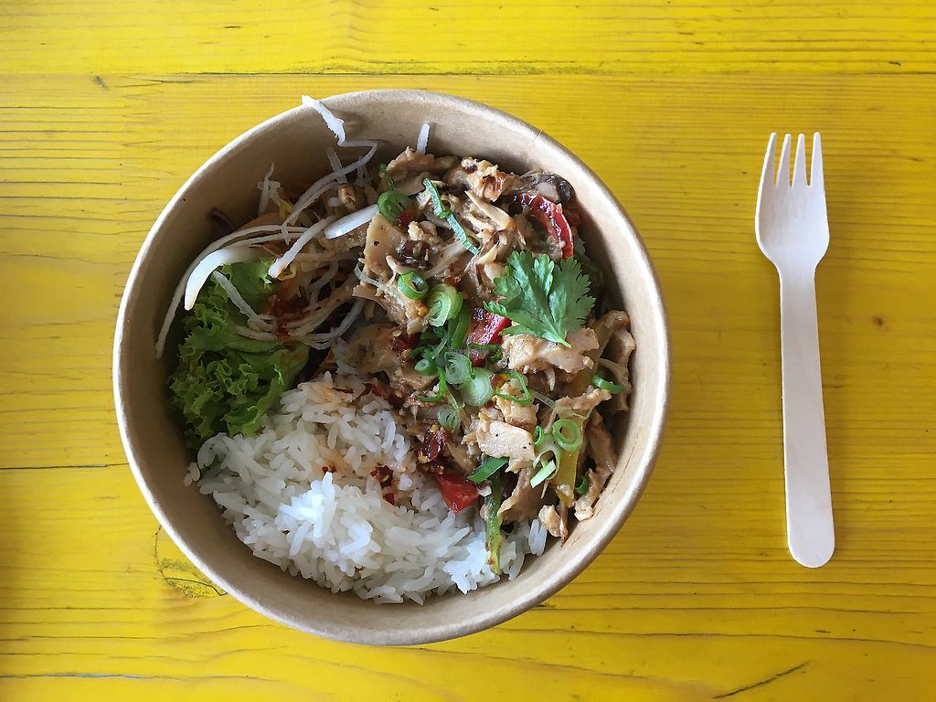 Fast service, good value, and very tasty. I had the jackfruit rice bowl which had golf flavours and textures. Bowl and cutlery recyclable/biodegradable. 3 well labelled vegan options. Plenty of space in the open area which also has a bar. Other food stalls are there too - I didn’t spot any others with vegan dishes.