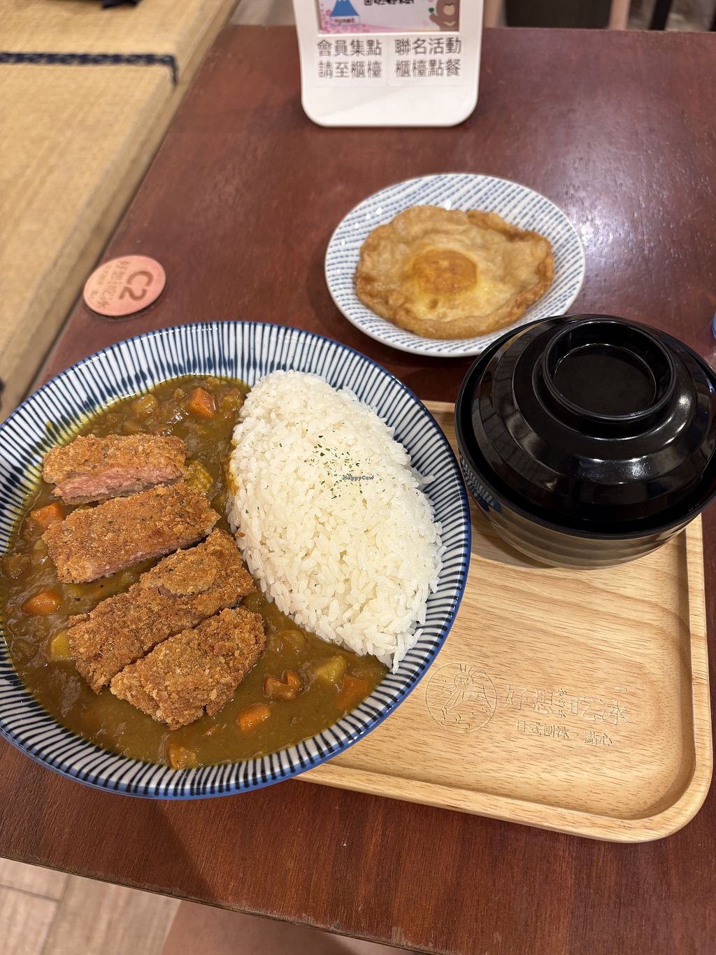 Omni Pork cutlet curry with miso soup and plant egg