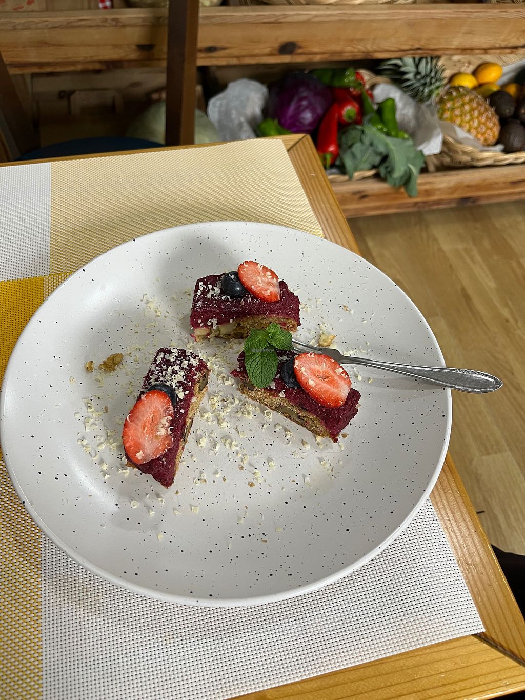 Exquisitely plated cake topped with fruit and mint and the coconut she…