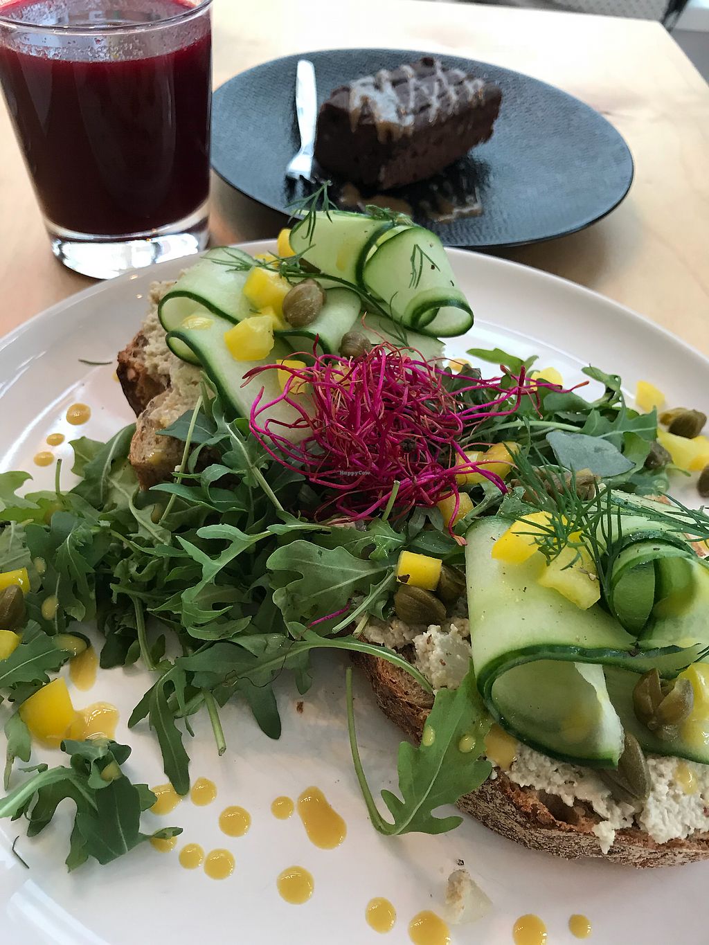 “Tuna” sandwich, beet juice and homemade brownie