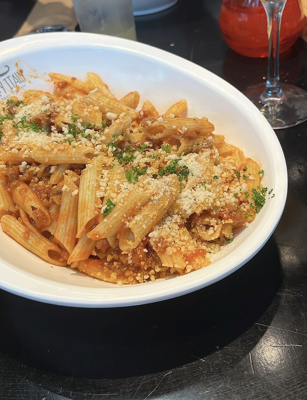 We had a vegan bolognese sauce and a vegan mushroom „carbonara“ Pasta. You can even choose the type of Pasta. Also it‘s topped with tasty cheese. Everything was super delicious and the service was good.