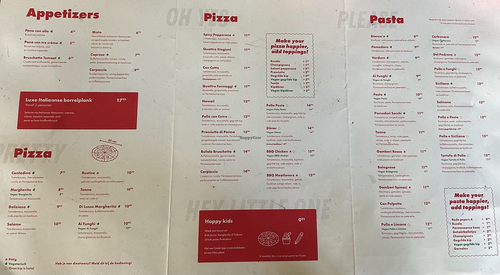 Serves meat, vegan options available. Netherlands based chain of casual dining Italian restaurants. Vegan dishes are clearly labelled on the menu. Choices for vegans include several kinds of vegan pizzas and pasta dishes (bianco, pommodore, alle verdure, del giardino, funghi) with creamy vegan sauces in addition to tomato sauce. Only accepts reservations for party of 10 or more. Open Mon-Sun 12:00-21:00.