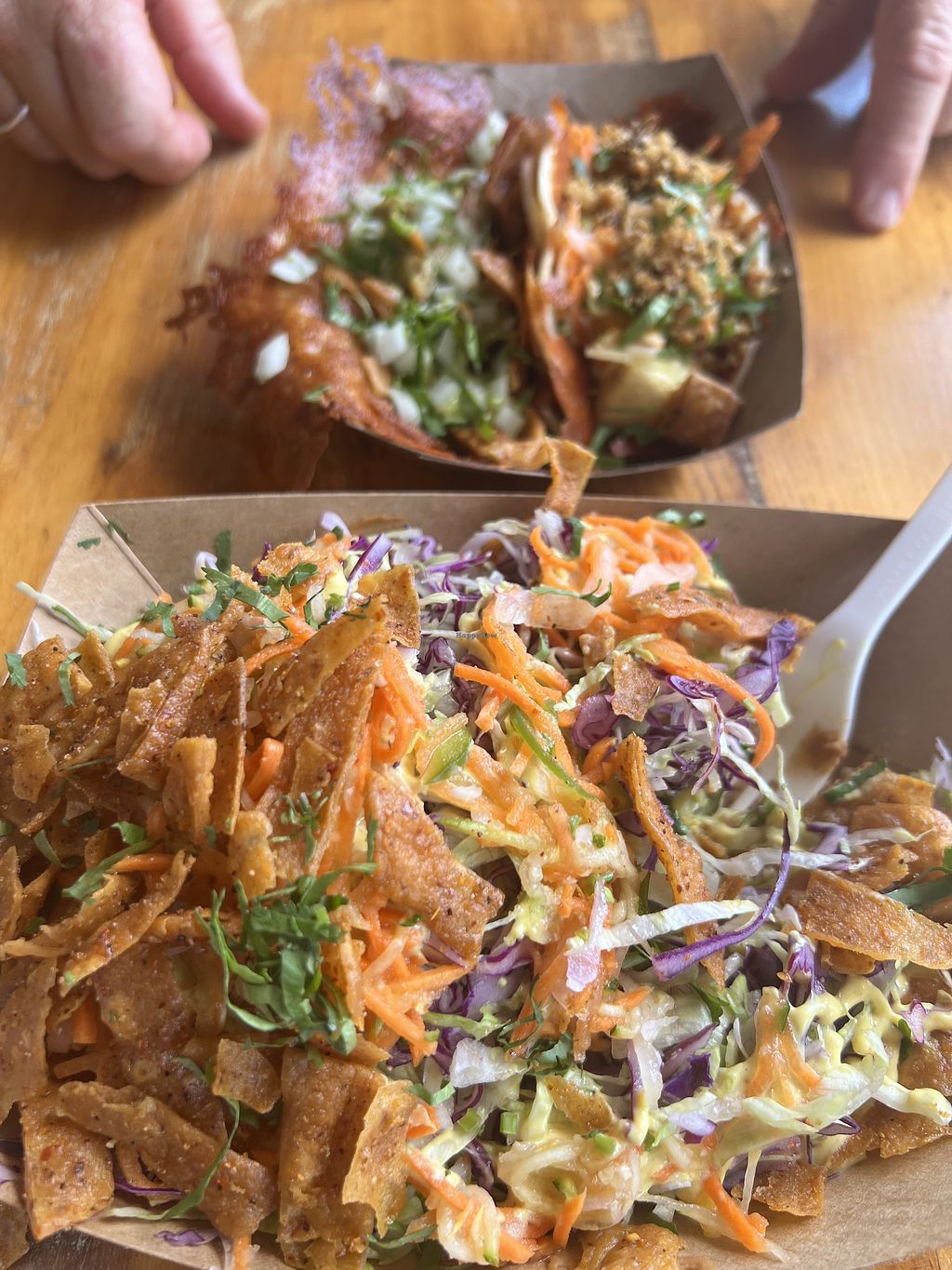 Separate vegan menu posted on the outside of their truck. There is a “secret menu” item online that we tried to order but the cook said she couldn’t do it bc they were too busy. 🧐 But very very happy with the two varieties of vegan tacos and the vegan burrito bowl ordered. Tons of flavor, creative ingredients (smoked potatoes, and deliciously seasoned crunchy tortilla strips, yum!). Would absolutely return to try more, and hopefully get our hands on that secret Crunchwrap.