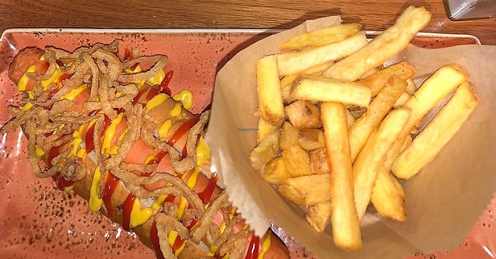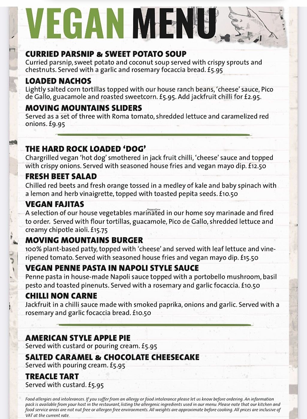 Read moreUpdate from visit 14/02/22: the new vegan menu is much more extensive than the previous and I really do appreciate the effort. However, after the service we had at our valentine's visit I cannot not reduce from 4 stars to 3. We had a booking at 9:30pm, we had a wait for our table, no vegan menu given, had to ask twice till I got given it. Our drinks took more than half an hour to get to our table, we didn't have a drink until 10:15, 45 mins after our booking and food came about 10 mins after that. I had the vegan hotdog which was OK, a bit bland and the chilli a bit watery. I'm going to give the benefit of the doubt given if was valentine's and as we love HRC, we will probably give it another try - maybe just for a drink.