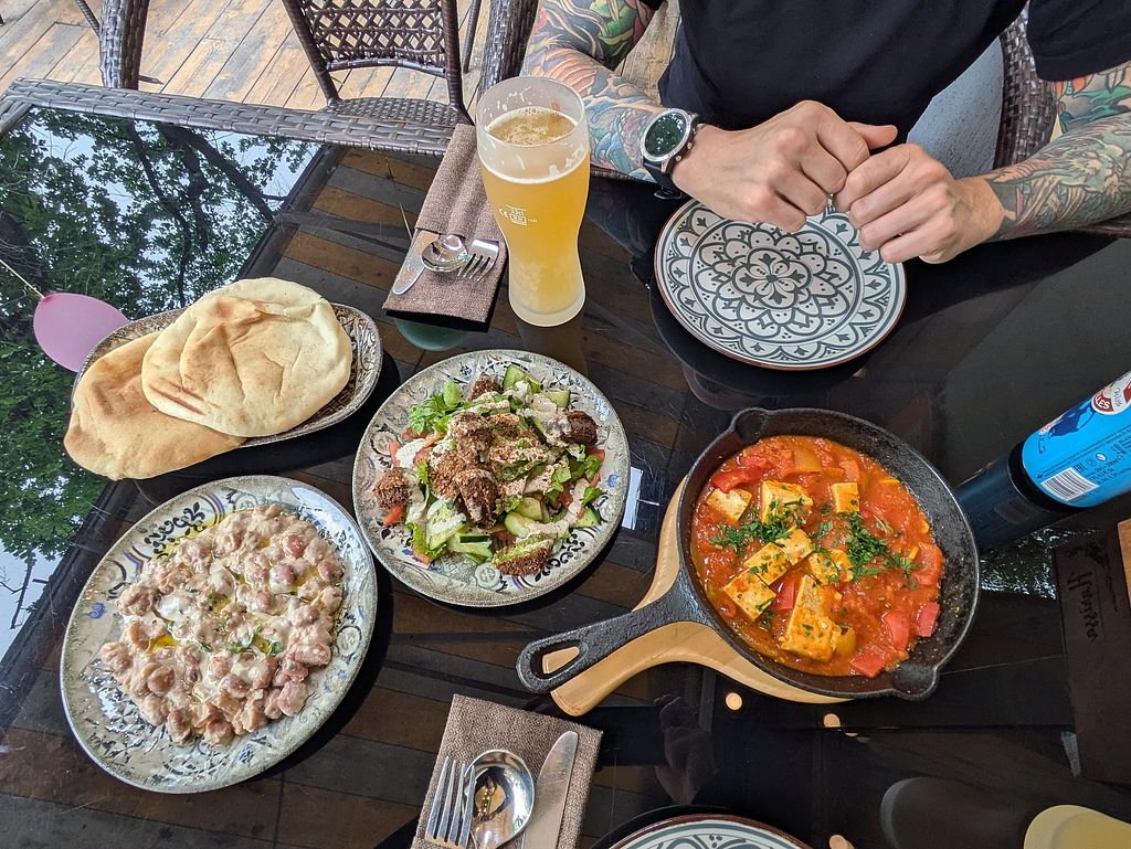 A rare vegan friendly middle eastern restaurant. Many vegan options, including tofu-shakshuka, assorted hummus with different toppings (mushrooms, fava beans, root vegetables and more), salads and more. Vegan dishes are clearly marked in the menu. Very friendly and attentive staff. A rare gem in a very non-vegan-friendly region.