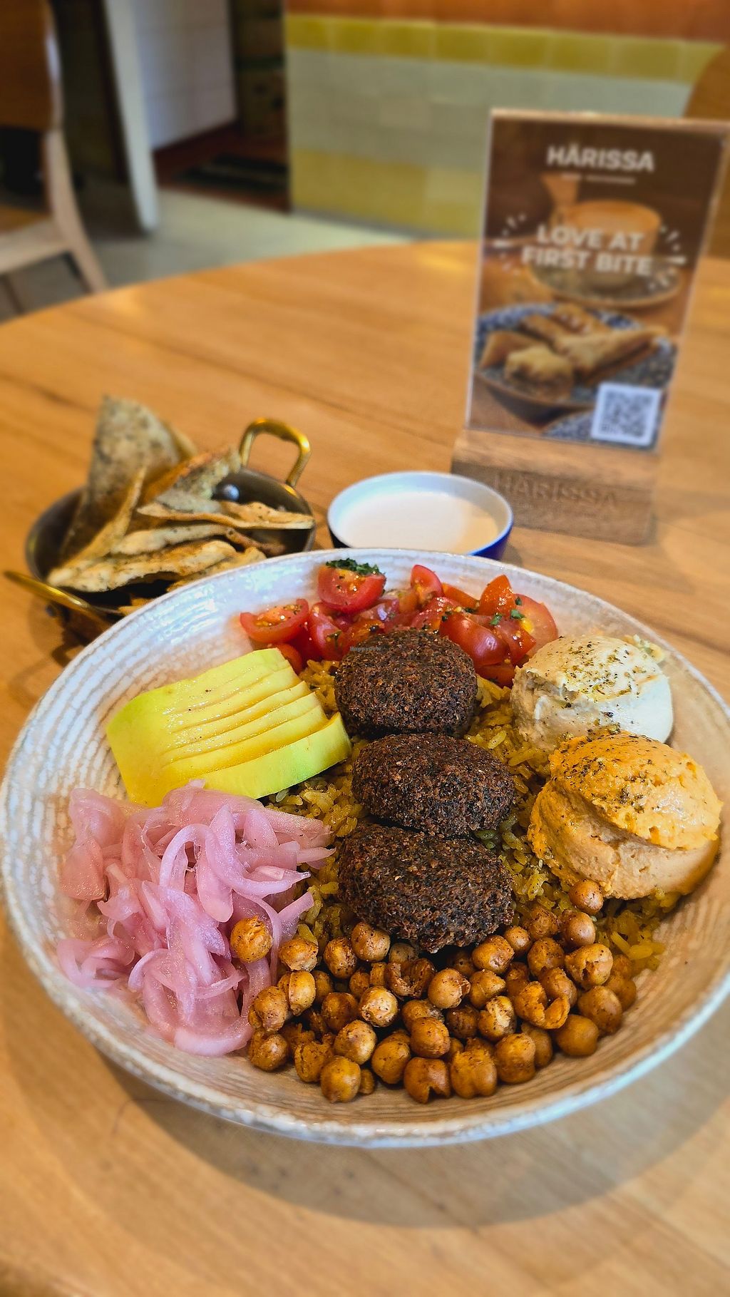 Pleasant, busy restaurant. I can only comment on the Vegano Bowl that I ordered and ate. It consisted of crispy chickpeas, three falafel balls with a tahini-type sauce on the side, sliced avocado with a gentle sauce, scoops of two different types of hummus, pickled onions, and all of this on a bed of herbed rice. Yes, it was more than enough but very delicious. There are other vegetarian and vegan options as well but I was only here once. It gets only four stars because Happy Cow reserves a 5-star rating for only total Vegan/Vegetarian eateries. Recommended if you are in the area.