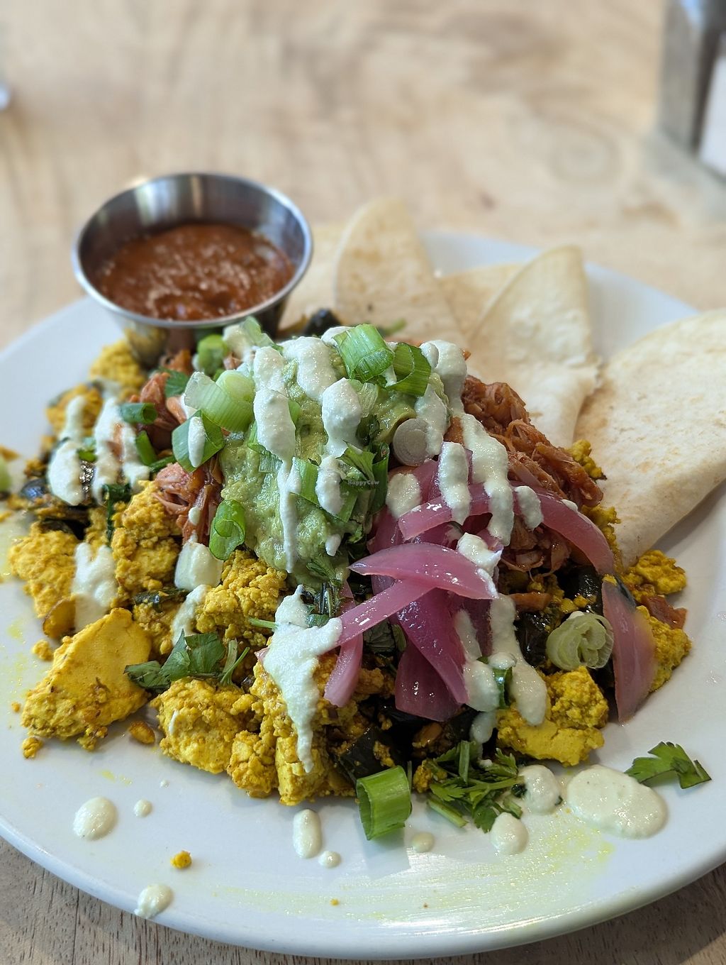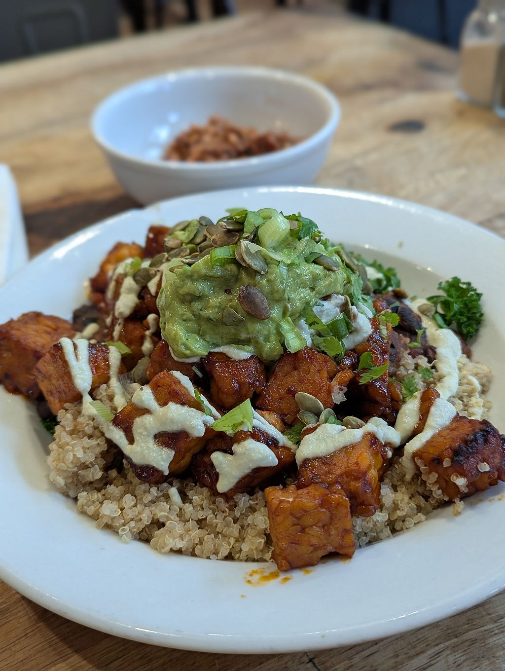 Outlaw scramble with quinoa, tempeh and black bean chilli
