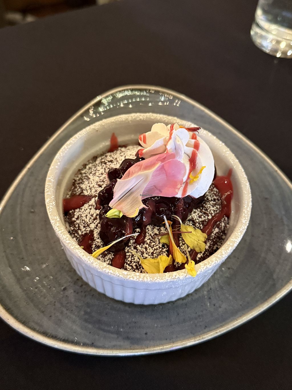 Red velvet chocolate lava cake with raspberry coconut whip cream.