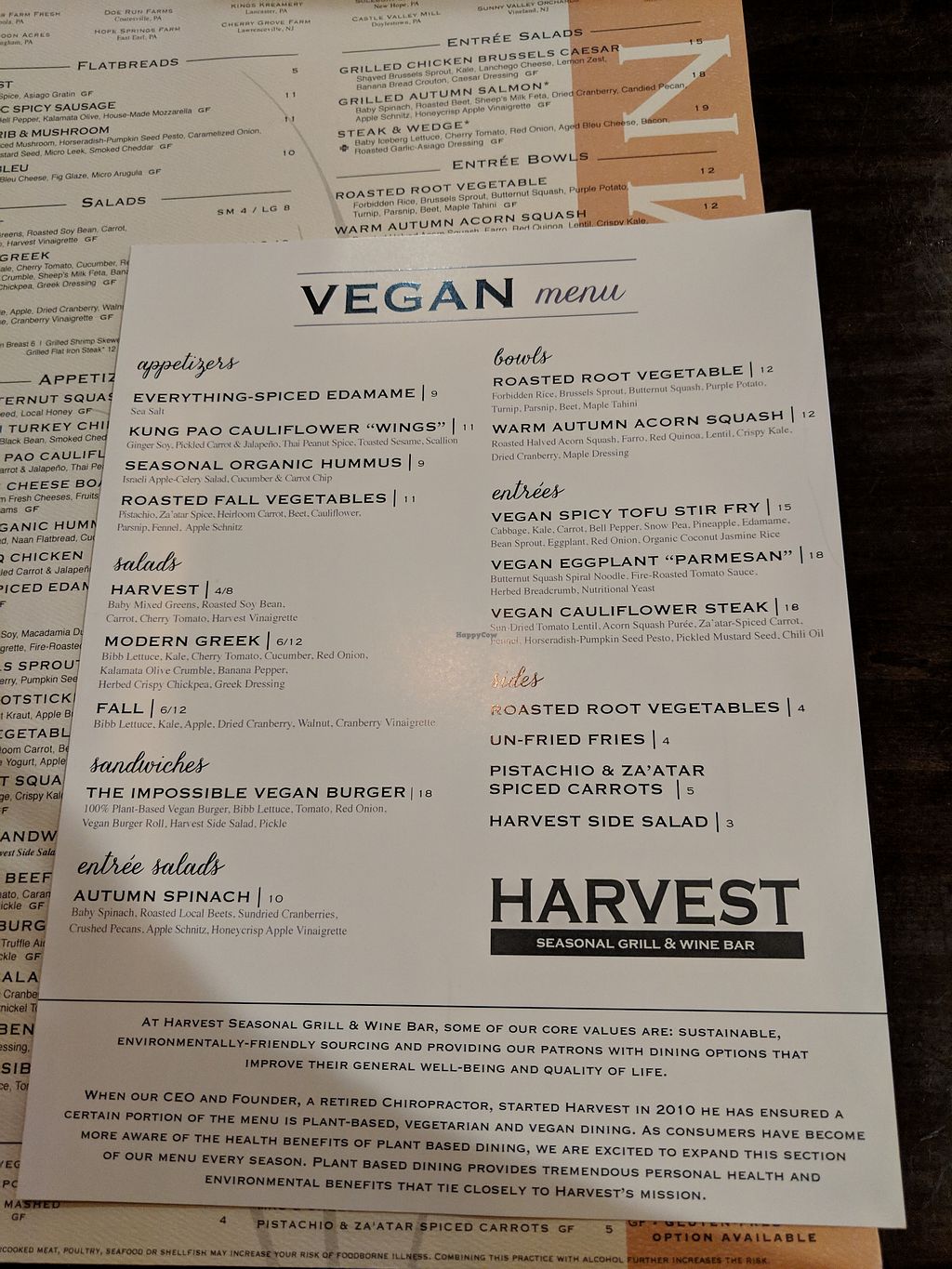 It was our first visit to a Harvest. After the server gave us a little explanation of their local, farm-to-table mission, and the farms they source from, she asked about dietary preferences, and very enthusiastically showed us how to identify vegan items on the menu, and went over dishes that can be made vegan, upon request. We had the kung pao cauliflower wings, which were unique, and delicious. My husband had the veggie burger, and I had the black beans and rice bowl, and the waitress recommended a vegan dessert. All of it was very excellent. Overall, we had a great experience. It was great to have a good number of vegan options, and there are many things we'd like to sample next time. We are looking forward to visiting again.
