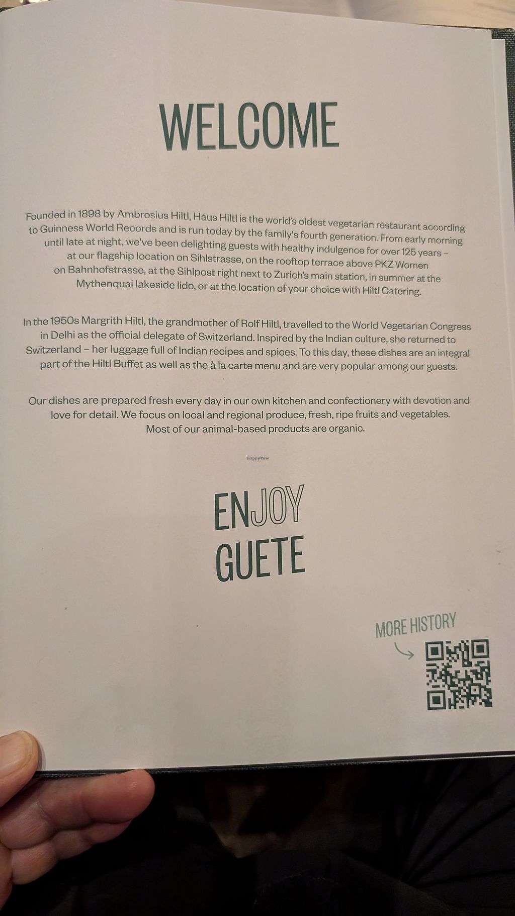 I learned of Hiltl and the long rich legacy over 12 years ago and tonight was my opportunity to indulge and visit this amazing restaurant. I was not that hungry but I wanted to sample the huge number of vegan options in the buffet. I ate until I felt like I was going to pop. My family loved the food too. I was mindful of how many famous vegans/vegetarians must have dined at this historic establishment. I’m glad to have experienced it. It was very expensive but for a once in a lifetime experience it was worth it. Make sure you make reservations- it’s extremely busy for good reason