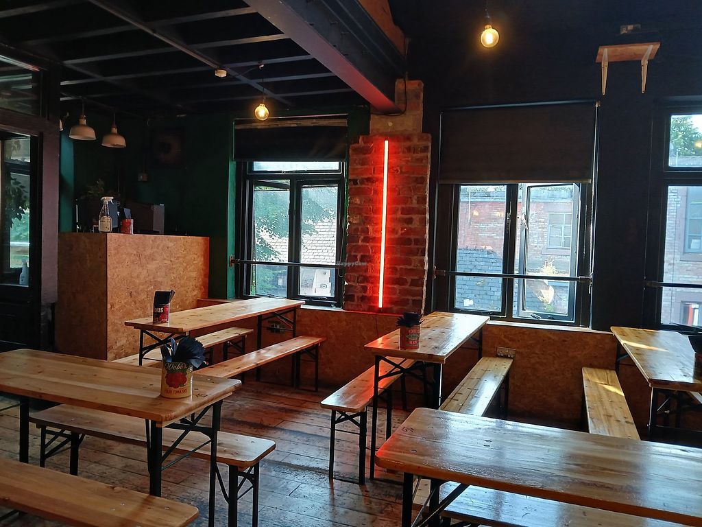 Serves meat, vegan options available. Restaurant offering a few vegan items such as pancakes, full English, pizzas and sides. Open Mon-Sun 10:00-01:00.