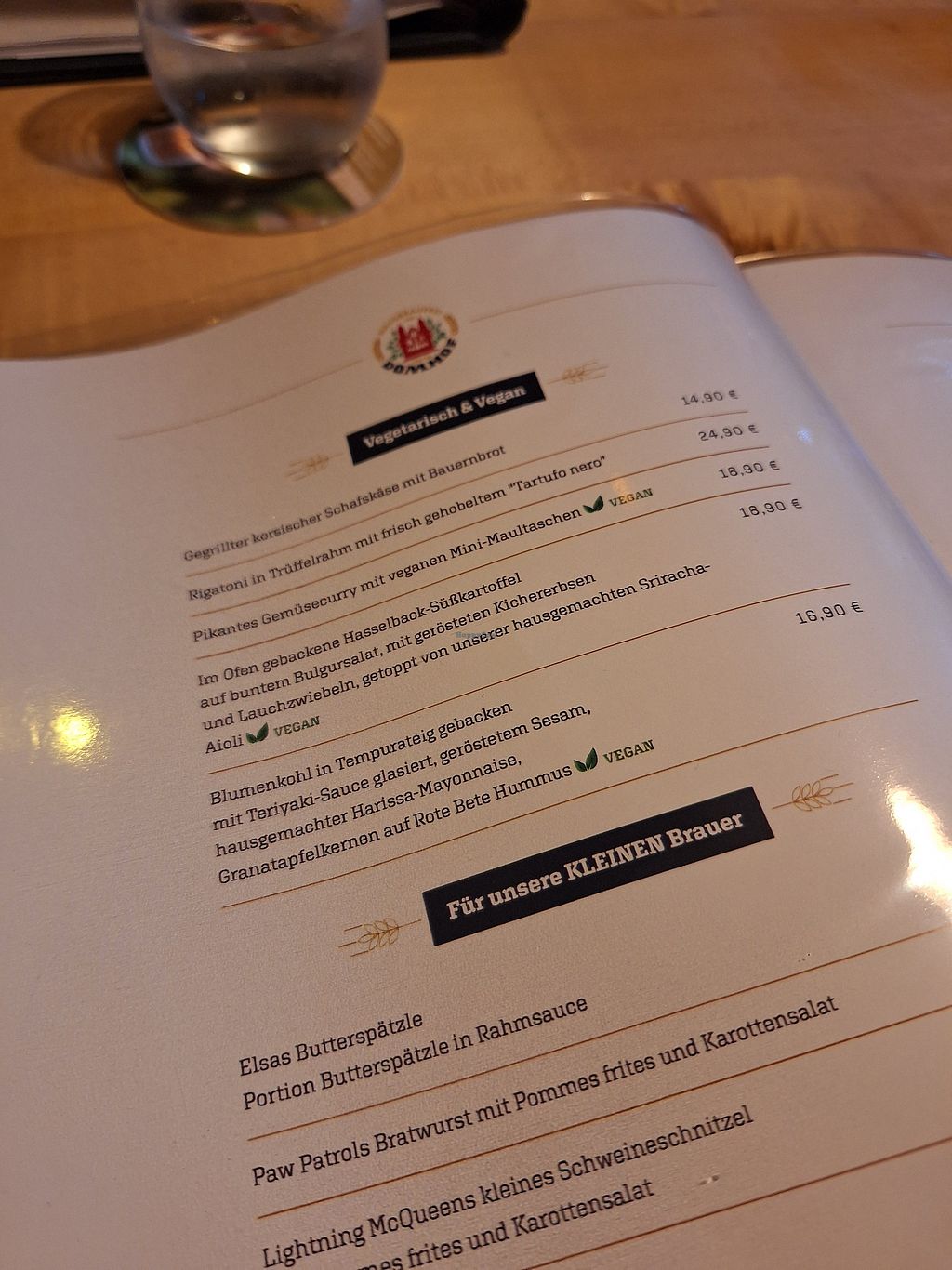 Es gibt wechselnde vegane Optionen. Der Plantbased burger war okay, aber leider kein Highlight für 19€. Brot hart, soße hat etwas gefehlt. Ja war okay. Das Restaurant hat weiter heftigen Fokus auf fleisch. Leider gabs kein veganes Spargel Gericht und schade dass es nicht pflanzlich Schnitzel gibt. Es gibt was das ist schonmal gut. Käsespätzle in vegan sind von der Karte verschwunden. Die fand ich gut.