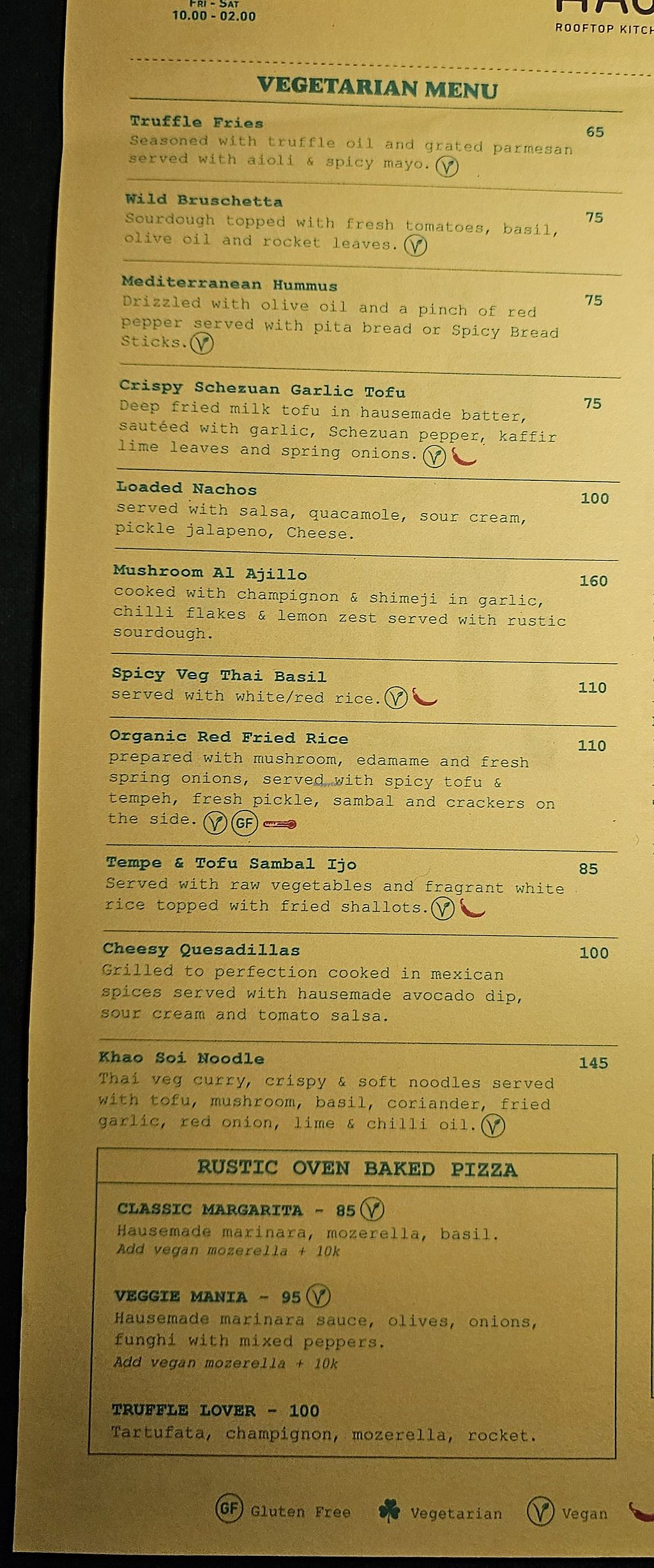 Serves meat, vegan options available. Upscale rooftop bar and restaurant offering vegan options, including pizza with vegan cheese, fried rice, spicy tofu, and hummus with pita. Open Mon-Thu 9:00am-12:00am, Fri-Sat 10:00am-2:00am, Sun 9:00am-12:00am.