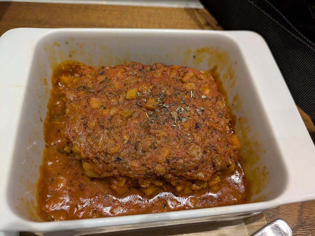 The lasagna is surprisingly big, juicy, tomatoy and contains a lot of vegetables and soy meat.