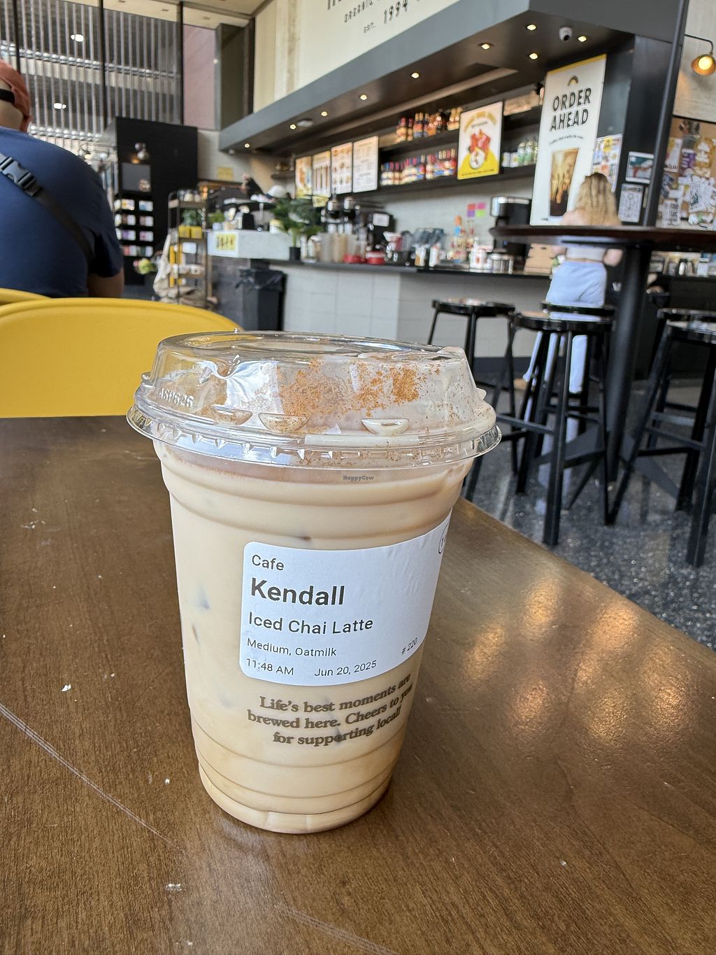 Got a chai, banana choco chip muffin, and the soy-rizo wrap. Chai was yum, muffin was dense but good, wrap had a good flavor, but the texture was eh. They must have them premade and then reheat— a bit soggy