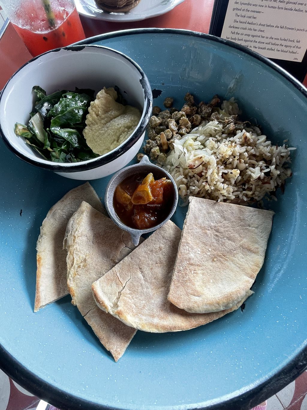I ordered the hummus platter and the loaded fries without cheese. The hummus itself was good, but everything on the platter seemed quite random and didn’t really work together for me. The loaded fries without cheese were nothing special. Maybe it was just the disappointing vegan options, but the dishes felt quite gimmicky and lacked flavour. Despite the many flies landing on the table, the restaurant itself seems promising and is beautiful, but it would be such an improvement if they can get a grip on their veg options.