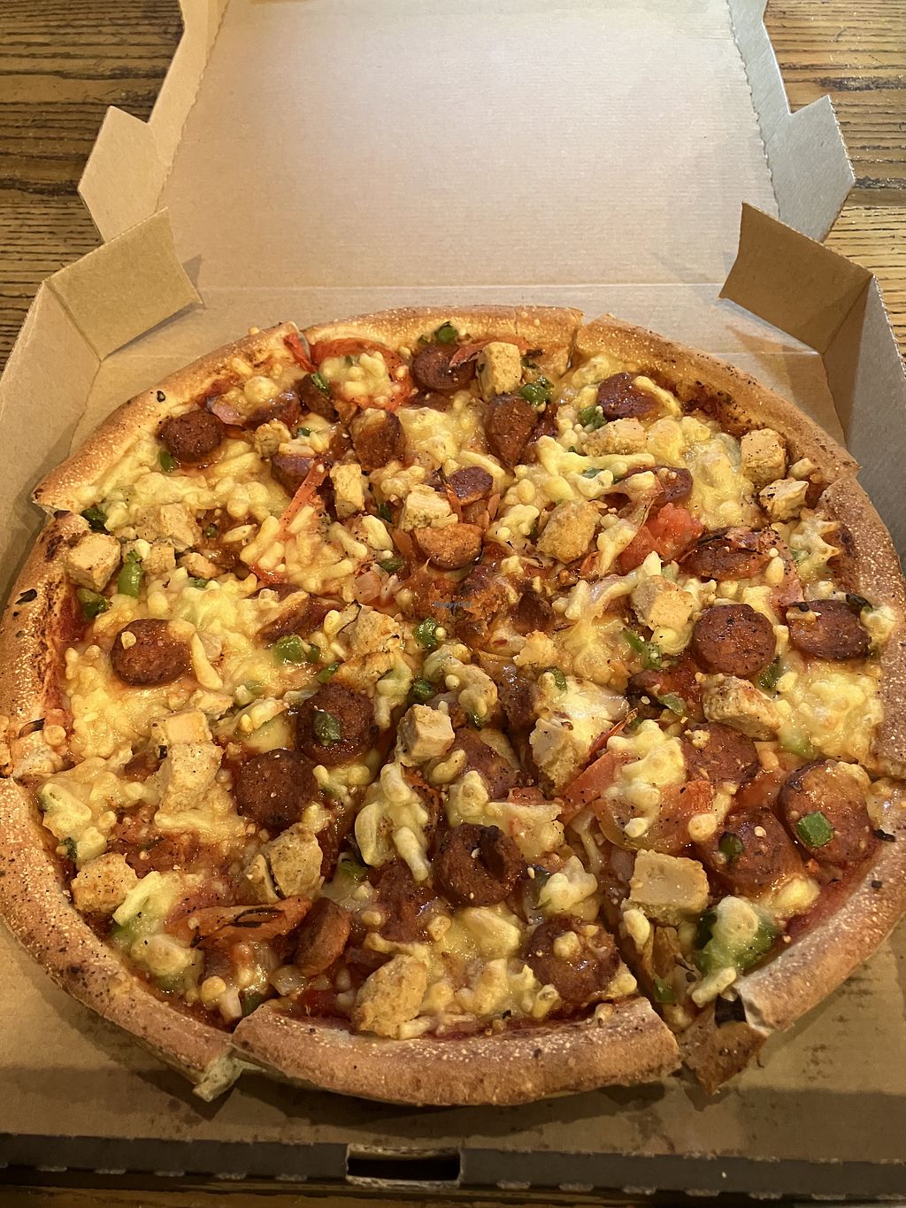 got garlic bread (not the best i’ve ever had but not bad) nuggets (good as hell) and a double pizza. quick service, good prices and always delicious