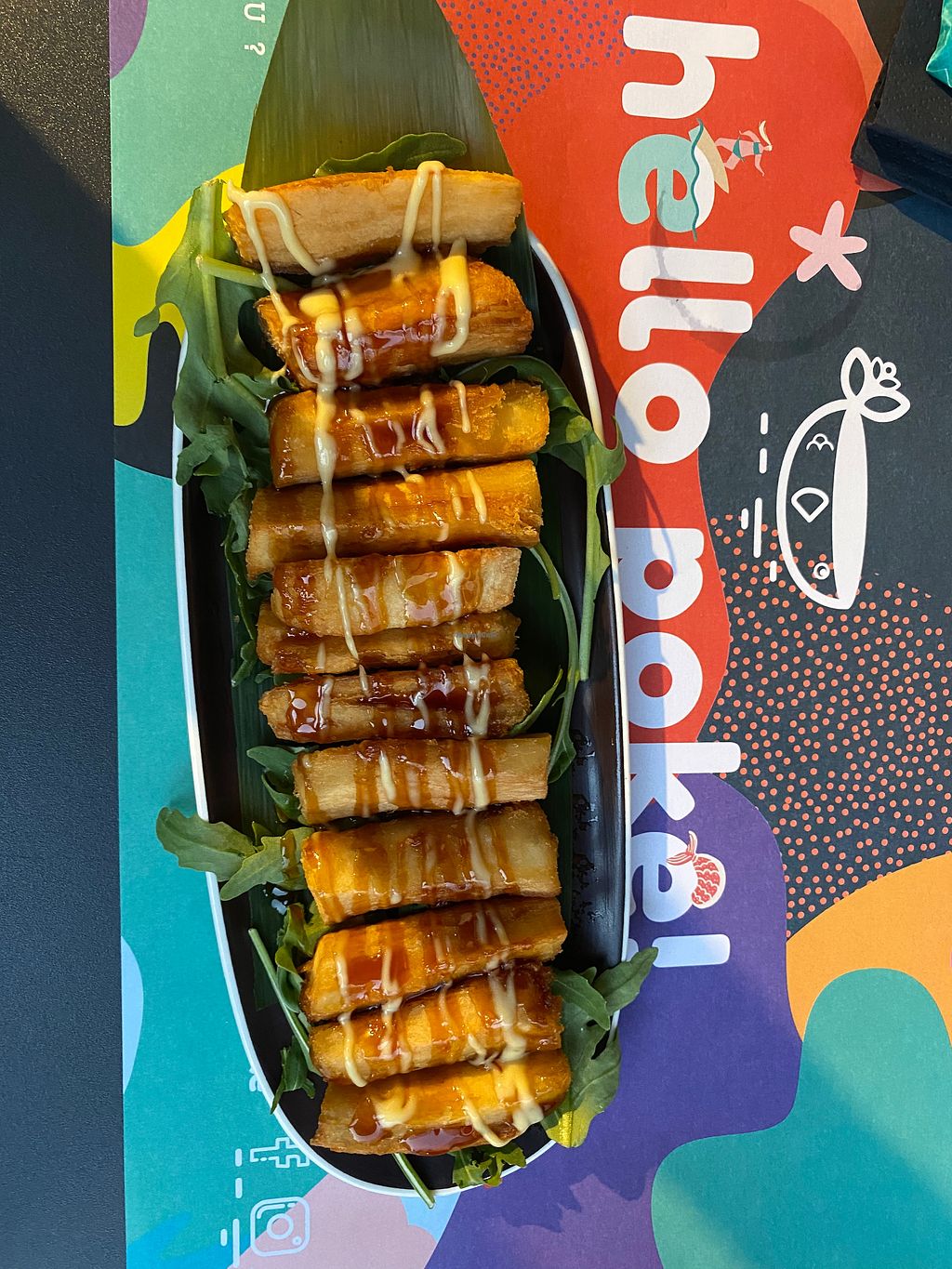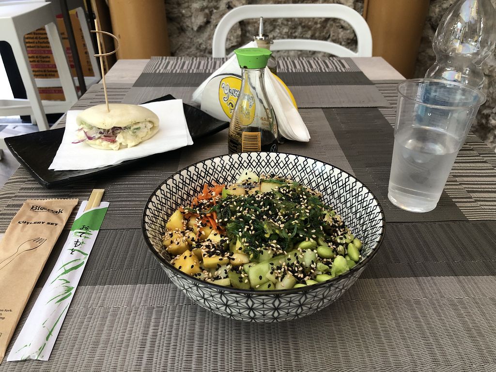 Serves meat, vegan options available. Hawaiian eatery serving poke bowls with the option for vegan bowls. Vegan ingredients include vegan mayonnaise, tofu, soy strips, a variety of vegetables, and soy sauce. Open Mon-Sun 12:00-15:00, 19:30-23:00.