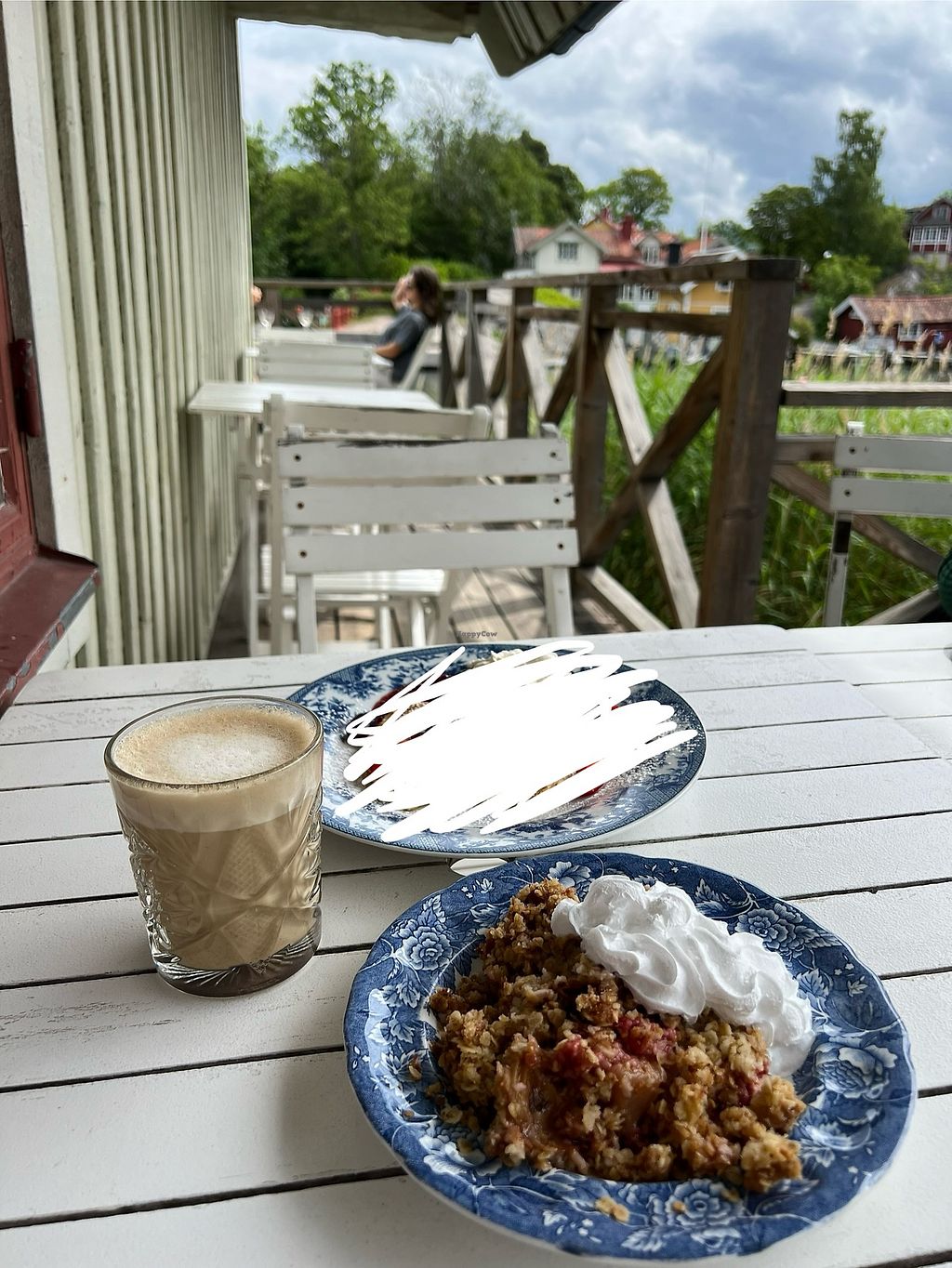 apricot crumble cake with vegan whipped cream and oat milk chai latte