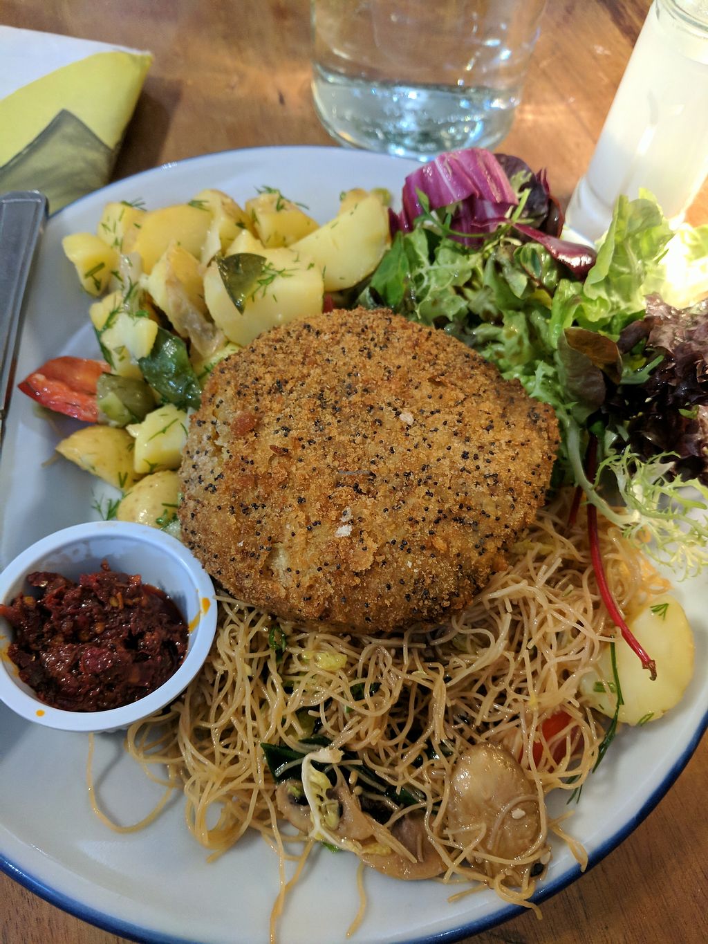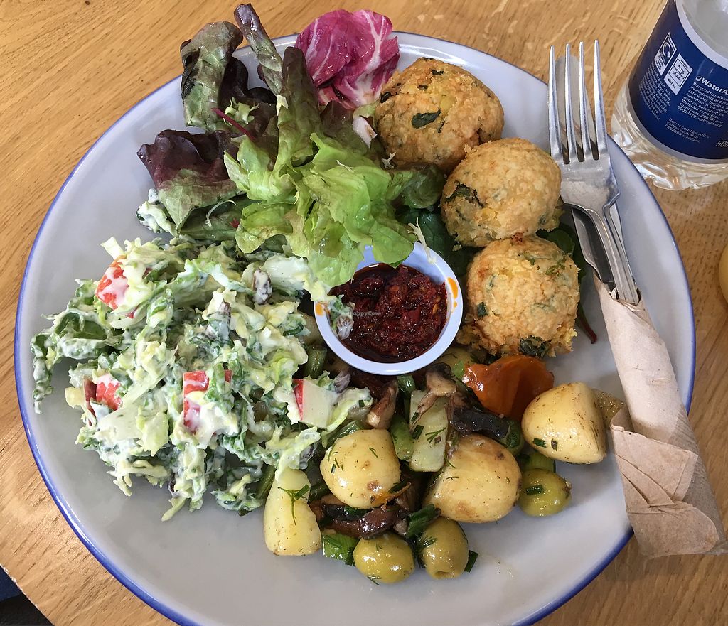 Falafel, harissa, green leaf salad, potato salad and fruity slaw. Deli…