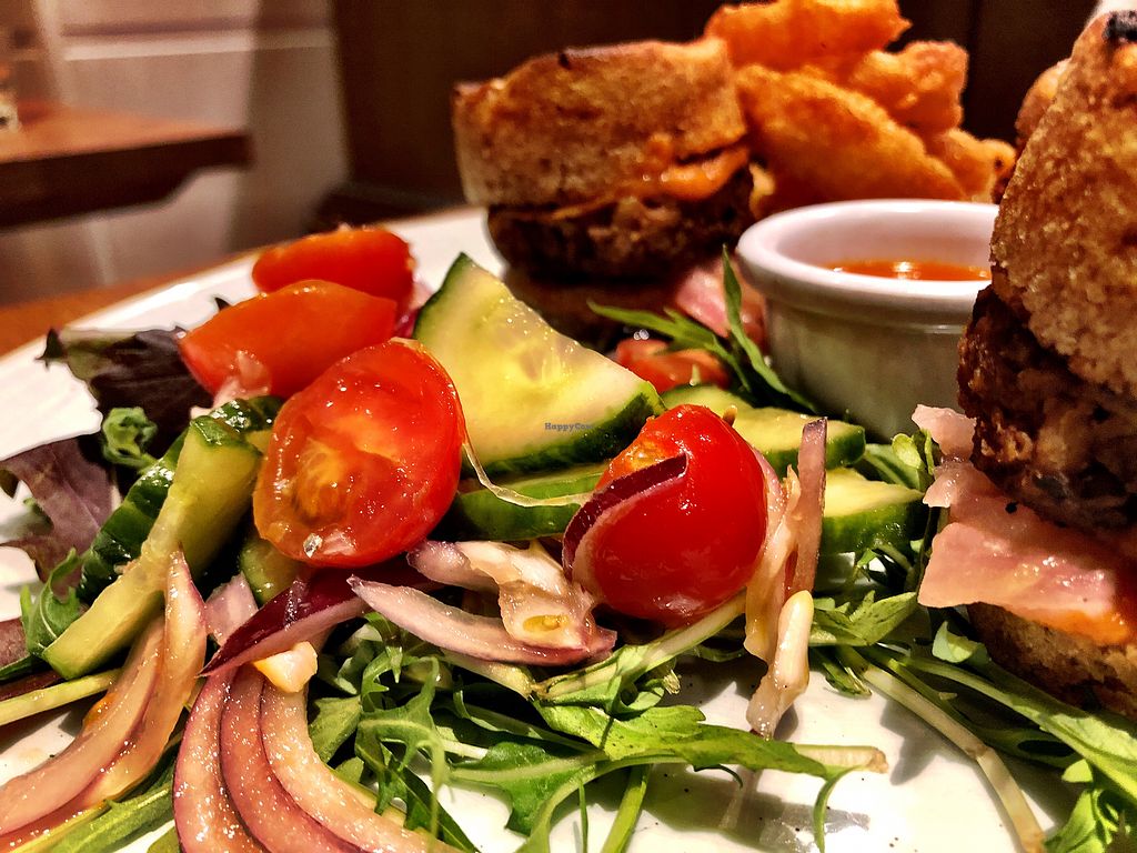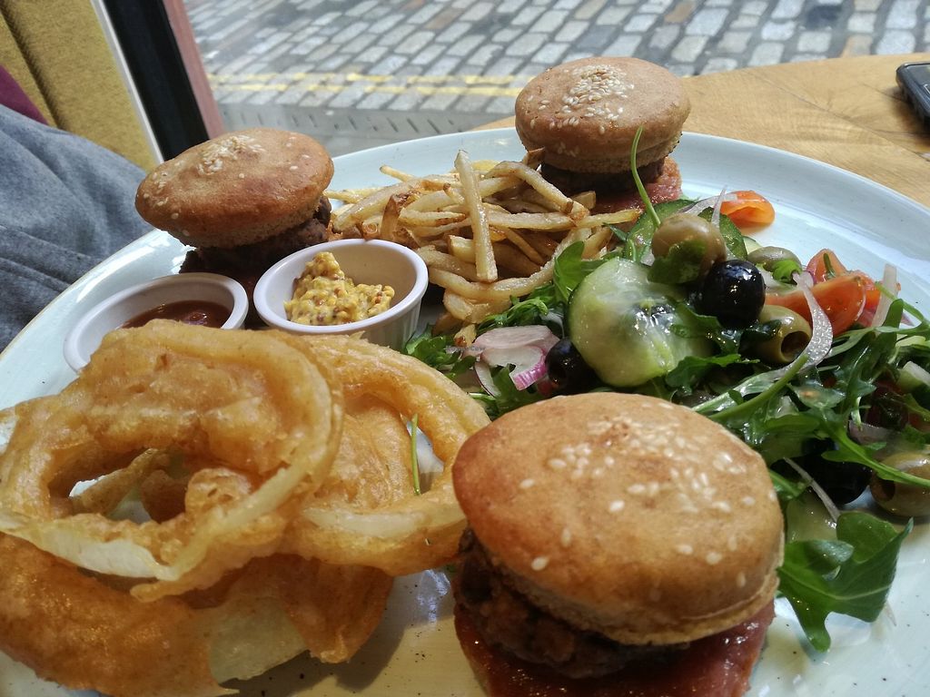 Read moreThe more observant among you will no doubt be aware that haggis, to quote Peter puppy from EWJ, is the "heart, liver and lips of a sheep, boiled in its own stomach"- but the vegan version is well seasoned, savoury legumes and grains (lentils, pearl barley) with a savoury sage infused red wine gravy and purple potatoes. Piled high and delicately flavoured. Wife got the wee mini burgers resplendent with onion rings and fries. Patties made from black beans and strong tasting with a sweet apple sauce compliment - well executed, generous, tasty. Got the special for dessert, a nice take on cheesecake with a light mousse sharp raspberry and biscuit base. Very good and I think more than reasonable for the taste. Be warned there aren't a lot of seats in the vegan bistro - but filled up quickly when we were in. Pretty quick and decent service. Baby change table too in downstairs bogs- in 1 stall so bit of a squeeze.