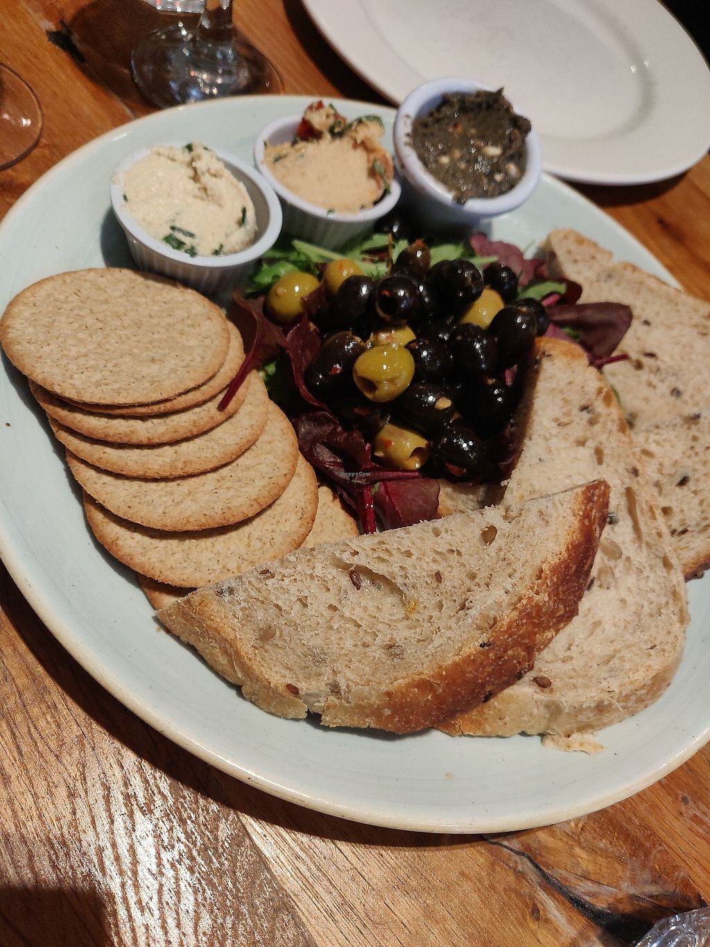 Back again and wow. Sharing plate starter with three dips, bread , crackers and olives.